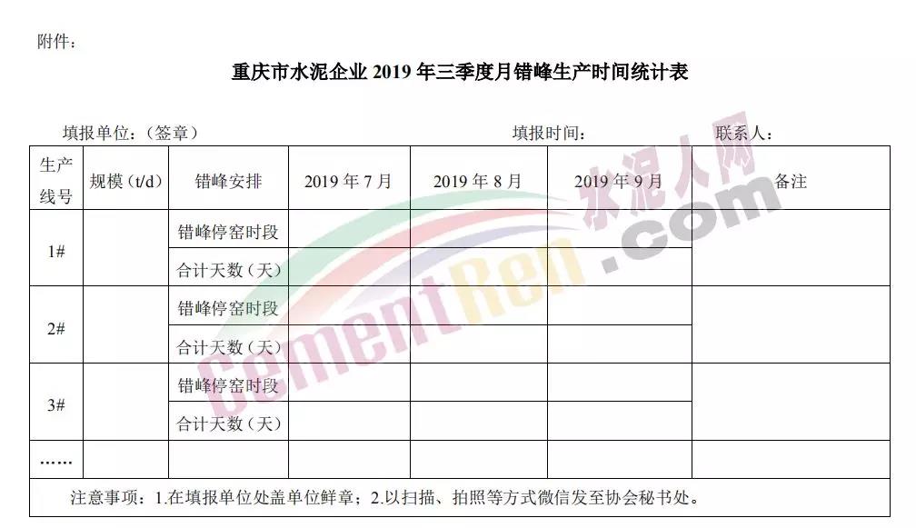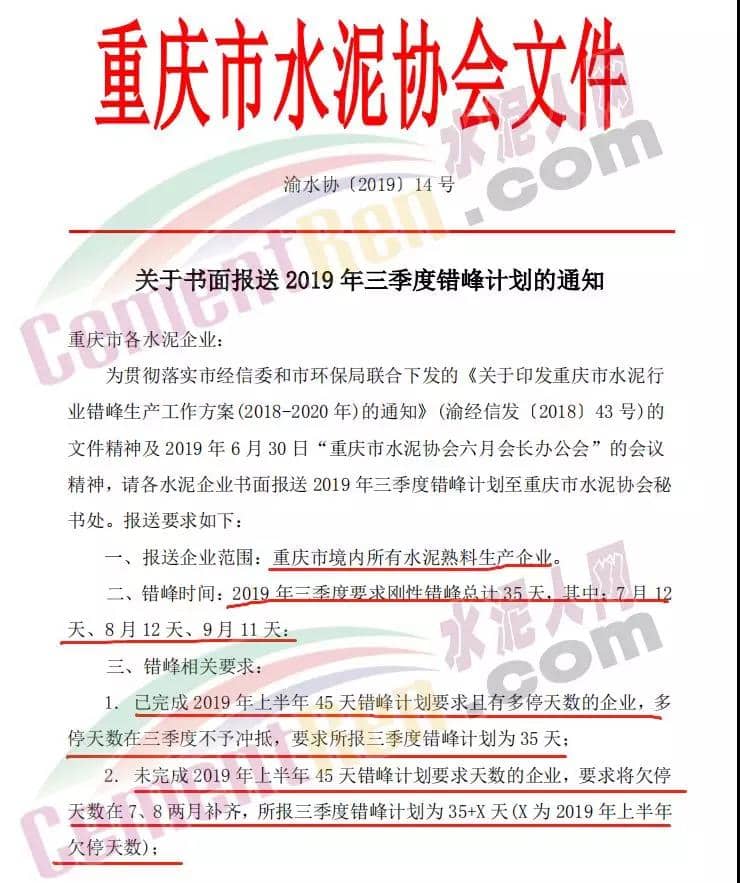 據(jù)水泥人網(wǎng)消息,7月1日,重慶市水泥協(xié)會發(fā)布《關(guān)于書面報送2019年三季度錯峰計劃的通知》,為貫徹落實市經(jīng)信委和市環(huán)保局聯(lián)合下發(fā)的《關(guān)于印發(fā)重慶市水泥行業(yè)錯峰生產(chǎn)工作方案(2018-2020 年)的通知》(渝經(jīng)信發(fā)〔2018〕43 號)的文件精神及2019年6月30日“重慶市水泥協(xié)會六月會長辦公會”的會議精神,請各水泥企業(yè)書面報送2019年三季度錯峰計劃至重慶市水泥協(xié)會秘書處。報送要求如下: