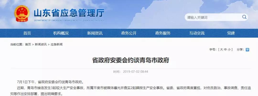 7月1日下午,山東省政府安全生產(chǎn)委員會召開安全生產(chǎn)約談會,因近期青島連續(xù)發(fā)生3起較大事故,青島市政府在此次會議上被約談。