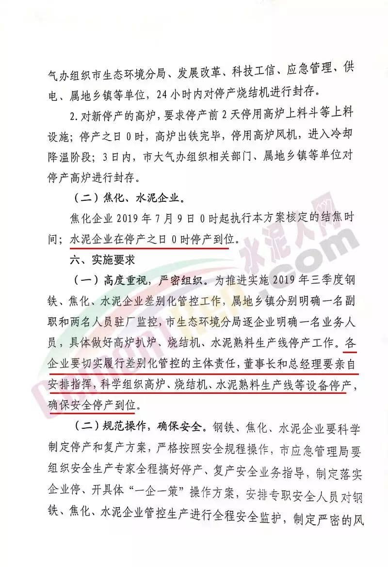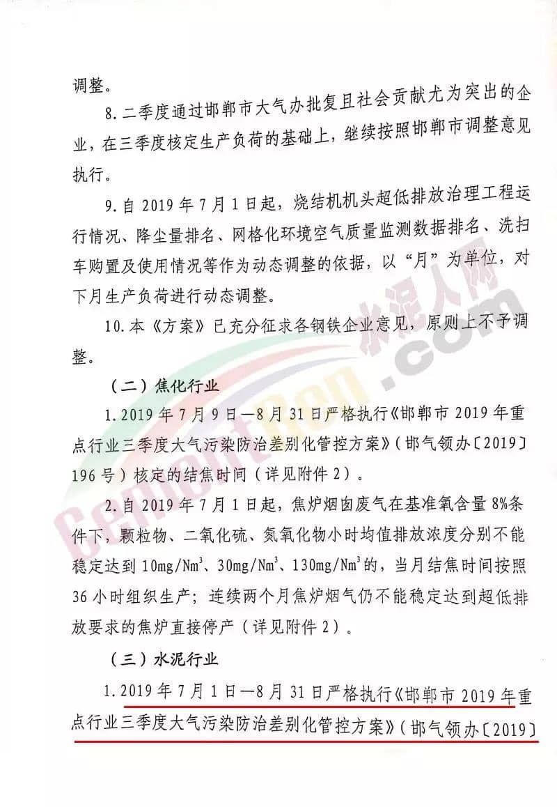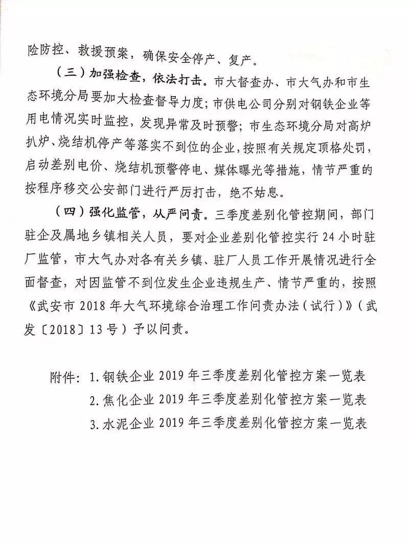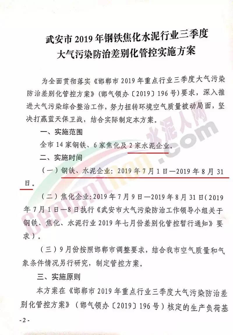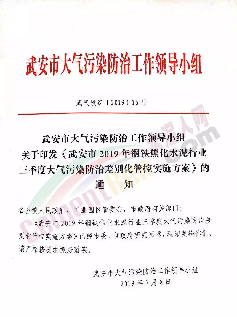 水泥人網(wǎng)消息:7月8日,武安市政府印發(fā)《武安市2019年鋼鐵焦化水泥行業(yè)三季度大氣污染防治差別化管控實施方案》的通知。要求在7月1日-8月31日期間,全市14家鋼鐵、6家焦化及2家水泥企業(yè)按照要求執(zhí)行錯峰停產(chǎn)政策,9月份結(jié)合本市的空氣質(zhì)量和氣象條件再另行制定管控方案。方案原文如下: