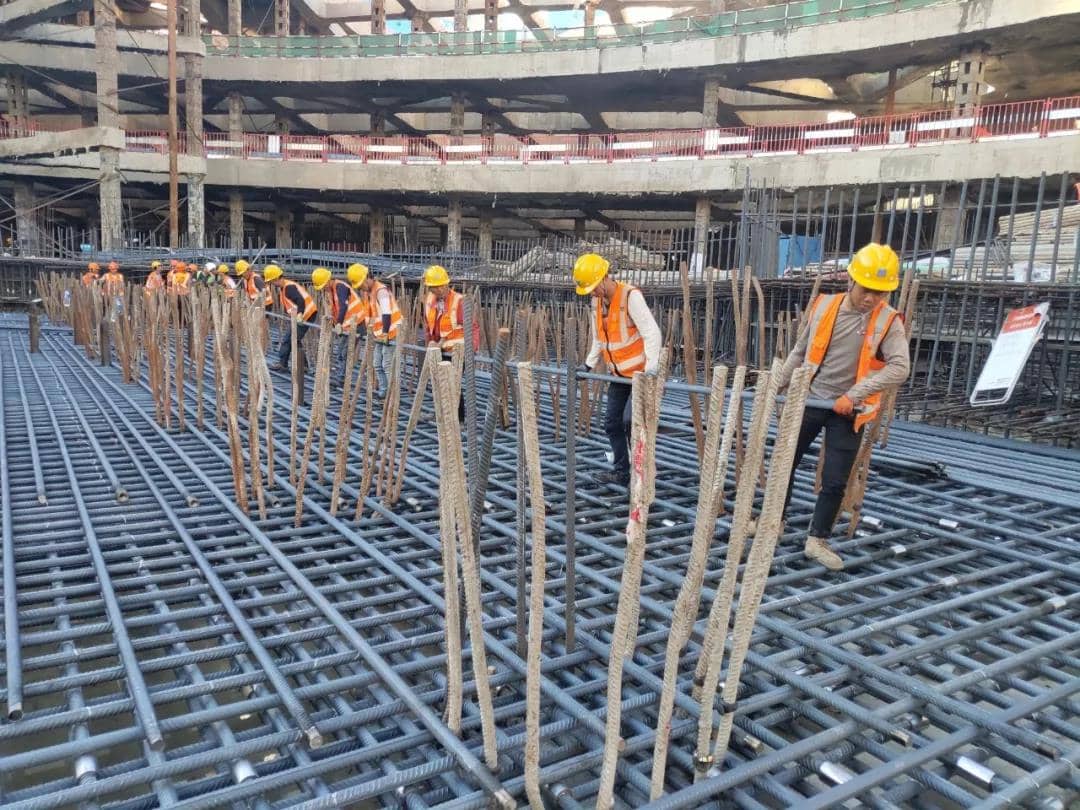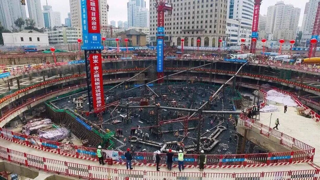 大高個的基礎(chǔ)如何造?該項目塔樓筏板基礎(chǔ)平均厚度達(dá)到5.5米,局部最厚位置近10米,筏板鋼筋的直徑為40毫米,每根重量達(dá)到120公斤,需要8到9名工人同時用力才能搬動。