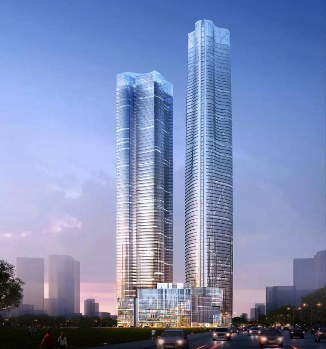 ▲ 春之眼項目占地面積約4萬平方米,總建筑面積約60萬平方米 ,由2棟超高層摩天大廈與高端商業(yè)中心組成,其中主塔共77層,高度407米,副塔308米,建成后將刷新云南天際線。