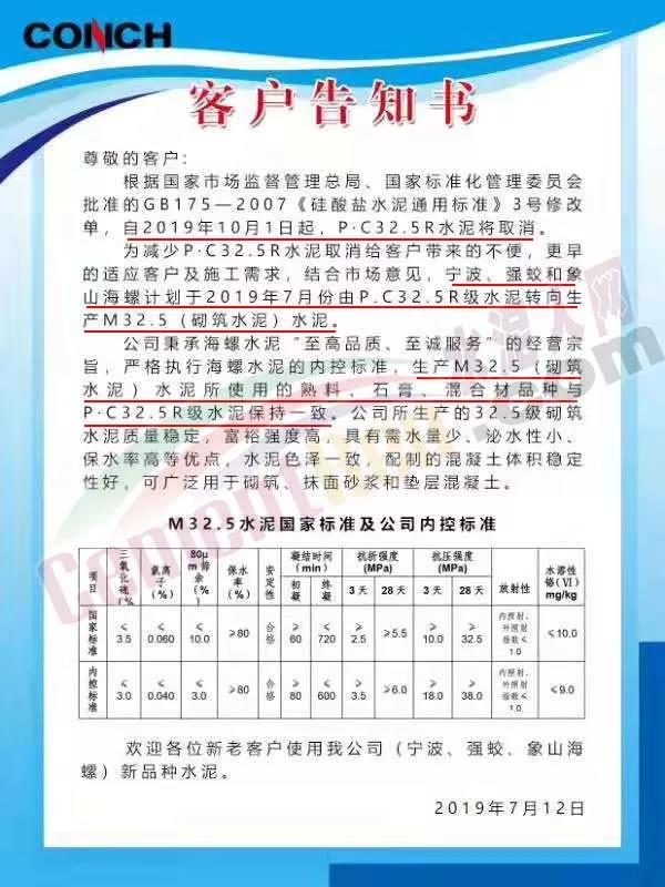 2、2019年8月1日至2019年9月30日為宣傳和并行期,在此期間PC32.5R水泥與砌筑M32.5水泥并行銷售,以方便廣大用戶工程施工轉換工作。