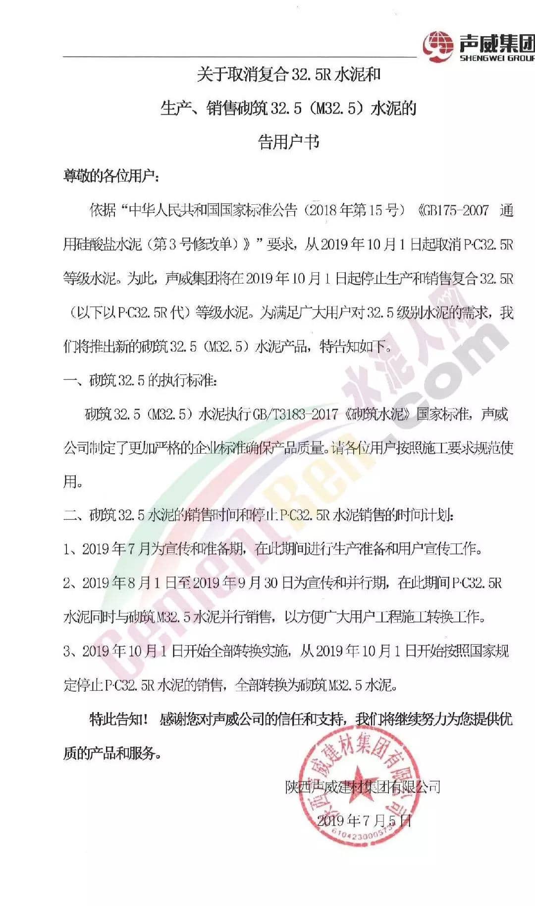 陜西聲威集團的告用戶書稱:根據“中華人民共和國國家標準公告(2018年第15號)《GB175-2007通用硅酸鹽水泥(第3號修改單)》”要求,從2019年10月1日起取消PC32.5R等級水泥。為此聲威集團將在2019年10月1日起停止生產和銷售復合32.5R(以下以PC32.5R代)等級水泥。為滿足廣大用戶對32.5級別水泥的需求,聲威集團將推出新的砌筑32.5(M32.5)水泥產品。