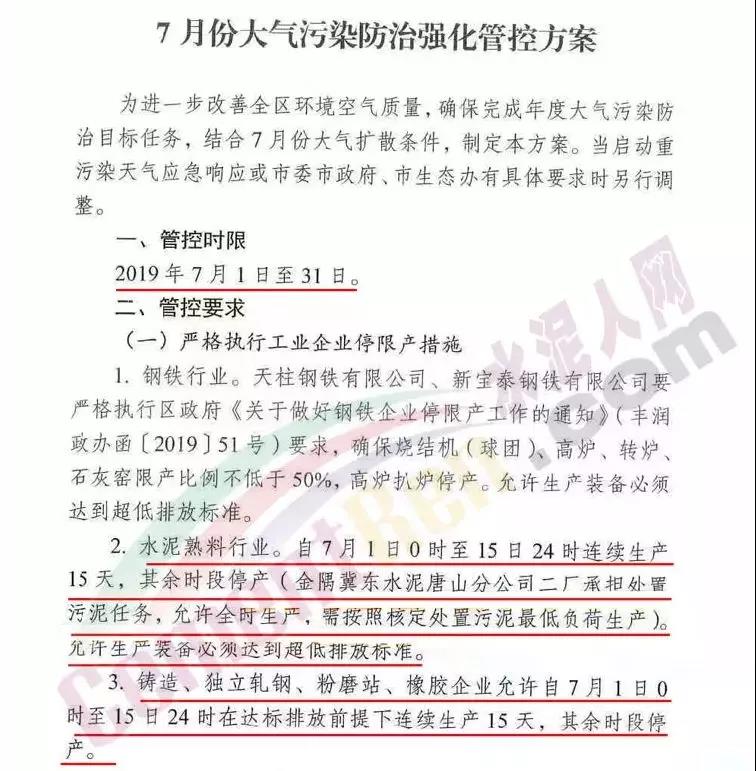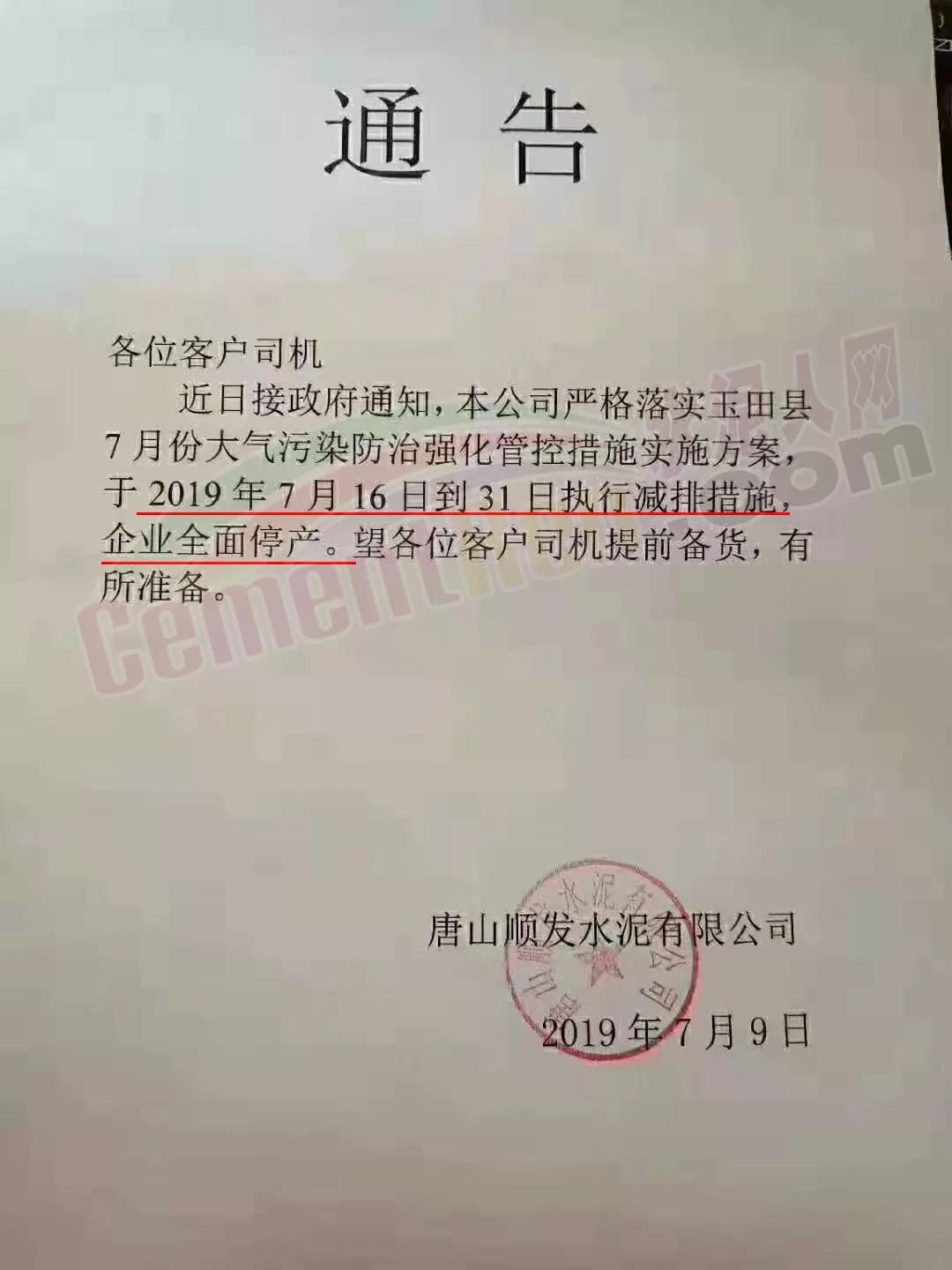 唐山順發(fā)水泥有限公司通知稱:近日接到政府通知,本公司嚴(yán)格落實玉田縣7月份大氣污染防治強化管控措施實施方案,于2019年7月16日到31日執(zhí)行減排措施,企業(yè)全面停產(chǎn)。望各位客戶司機提前備貨,有所準(zhǔn)備。