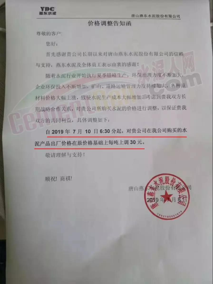 唐山燕東水泥發(fā)布《價格調(diào)整告知函》稱:隨著水泥行業(yè)開始執(zhí)行夏季錯峰生產(chǎn),環(huán)保治理力度不斷加大,企業(yè)環(huán)保投入不斷增加,礦山道路運輸管理力度持續(xù)加大,各種原材料價格大幅上漲,致使水泥生產(chǎn)成本大幅增加,因此對產(chǎn)品價格做出調(diào)整。具體調(diào)整為,自2019年7月10日06:30起,水泥產(chǎn)品出廠價格在原價格基礎(chǔ)上,每噸上調(diào)30元。