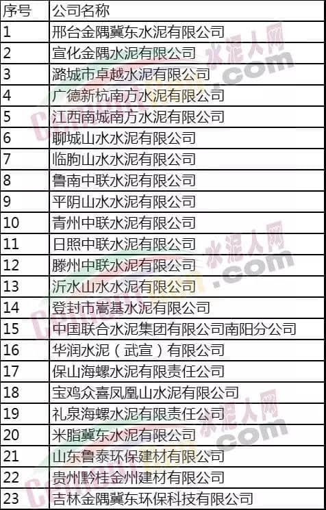 本次公布的綠色工廠(chǎng)名單當(dāng)中,包括邢臺(tái)金隅冀東水泥有限公司、廣德新杭南方水泥有限公司、聊城山水水泥有限公司、青州中聯(lián)水泥有限公司、保山海螺水泥有限責(zé)任公司、華潤(rùn)水泥(武宣)有限公司等23家水泥企業(yè),具體名單如下: