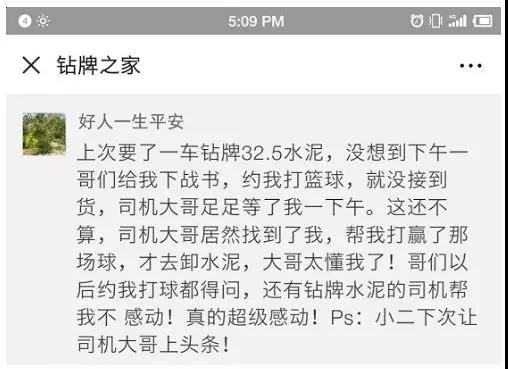 “好人一生平安”留言稱,說他因?yàn)榇蚯虻⒄`了收貨,司機(jī)大哥不僅等著他,還幫他打贏了球賽,才去卸水泥,哥們以后約我打球都問,還有鉆牌水泥的司機(jī)幫忙嗎,真的超級(jí)感動(dòng)。