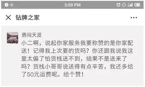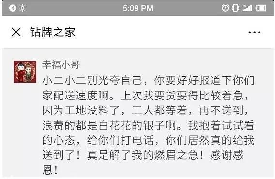 “幸福小哥”則留言稱,對鉆牌之家配送速度相當(dāng)滿意。確實(shí),如果工人等著干活,卻沒有材料是一件很捉急的事情,給鉆牌之家打電話,居然真的送到了,真是雪中送炭。