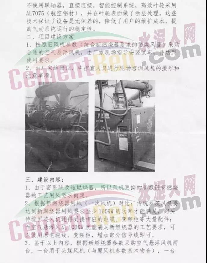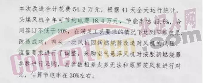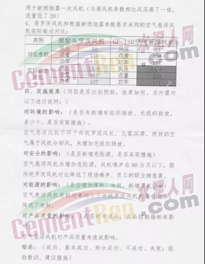 2、窯頭空氣懸浮風(fēng)機(jī):因燃燒器改造后風(fēng)壓要求高于原燃燒器一倍,訂購(gòu)空氣懸浮風(fēng)機(jī)時(shí)按照新燃燒器設(shè)計(jì)參數(shù)采購(gòu),對(duì)比實(shí)際參數(shù)做功時(shí)按照空氣懸浮風(fēng)機(jī)風(fēng)壓、流量接近于原羅茨風(fēng)機(jī)進(jìn)行,上圖中標(biāo)黃數(shù)據(jù)為接近原羅茨風(fēng)機(jī)的參數(shù)和用電量;根據(jù)對(duì)比節(jié)電率為30.5%,達(dá)到合同簽訂要求。