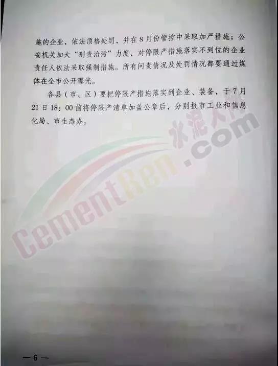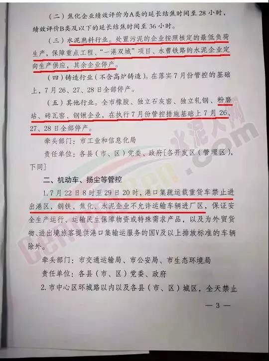 處置污泥的企業(yè)按照核定的最低負荷生產(chǎn),保障重點工程、“一港雙城”項目、水曹鐵路的水泥企業(yè)定向生產(chǎn)供應,其余企業(yè)停產(chǎn);他行業(yè)。全市粉磨站、磚瓦窯、鋼鍬等企業(yè),在執(zhí)行7月份管控措施基礎上7月26、27、28日全部停產(chǎn)。
