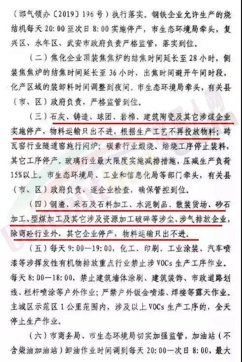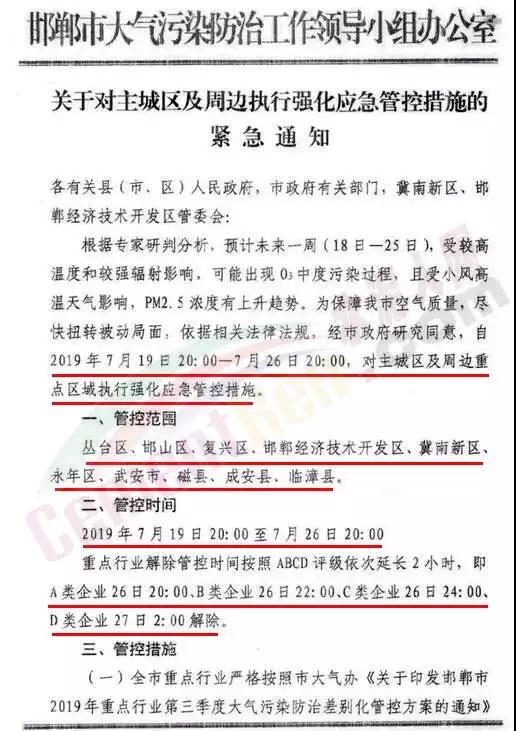 同期,邯鄲市大氣污染防治工作領導小組辦公室也發(fā)布了緊急通知,邯鄲市于2019年7月19日20.00-7月26日20:00,對主城區(qū)及周邊執(zhí)行大氣污染防治強化應急管控措施。管控地區(qū)包括邯山區(qū)、復興區(qū)、邯都經(jīng)濟技術開發(fā)區(qū)、冀南新區(qū)、永年區(qū)、武安市、磁縣、成安縣、臨潭縣。