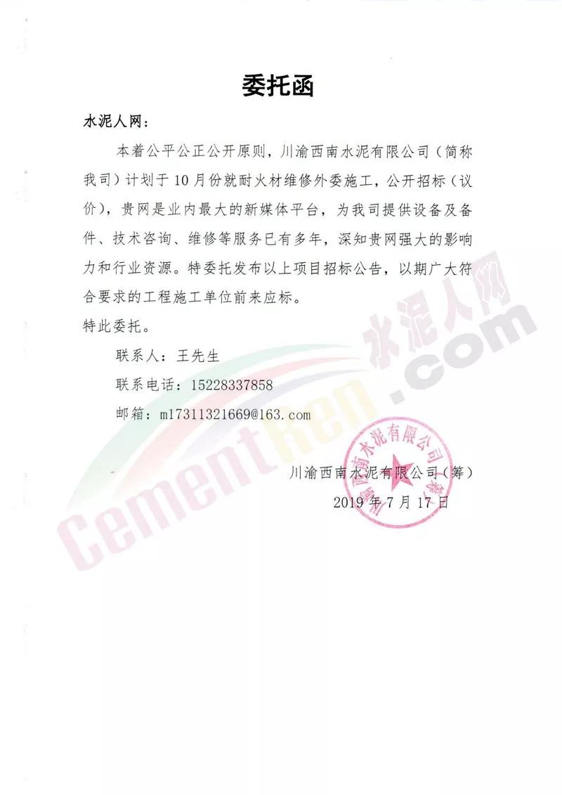 川渝西南水泥有限公司(籌)是西南水泥有限公司的旗下子公司,公司目前在運(yùn)行的新型干法窯有 39 條?,F(xiàn)面向社會(huì)統(tǒng)一對(duì)回轉(zhuǎn)窯系統(tǒng)耐火材料 2020 年度維修施工工程進(jìn)行招標(biāo)。