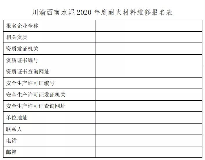 2019 年 9 月 20 日 以 前 發(fā)送到m17311321669@163.com,文件名稱一律以“耐火材料維修+公司簡(jiǎn)稱+資質(zhì)名稱”的形式發(fā)送。報(bào)名預(yù)審不接受書面材料。