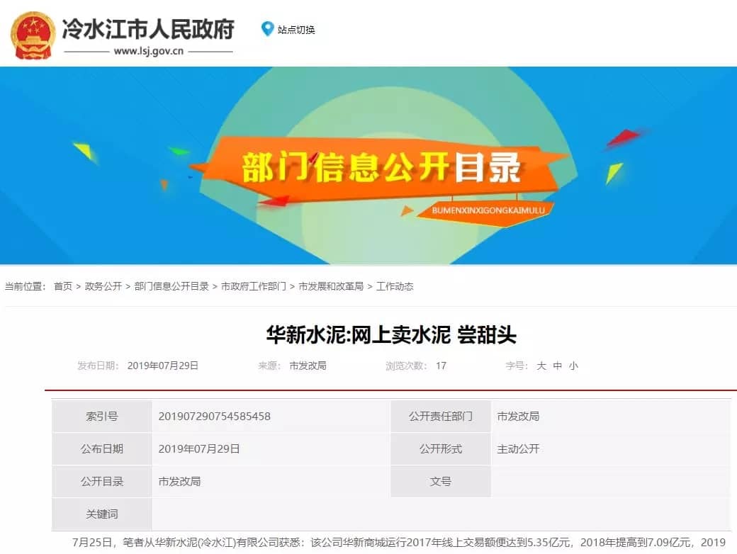 7月25日,筆者從華新水泥(冷水江)有限公司獲悉:該公司華新商城運行2017年線上交易額便達到5.35億元,2018年提高到7.09億元,2019年上半年已實現(xiàn)交易額3.62億元。