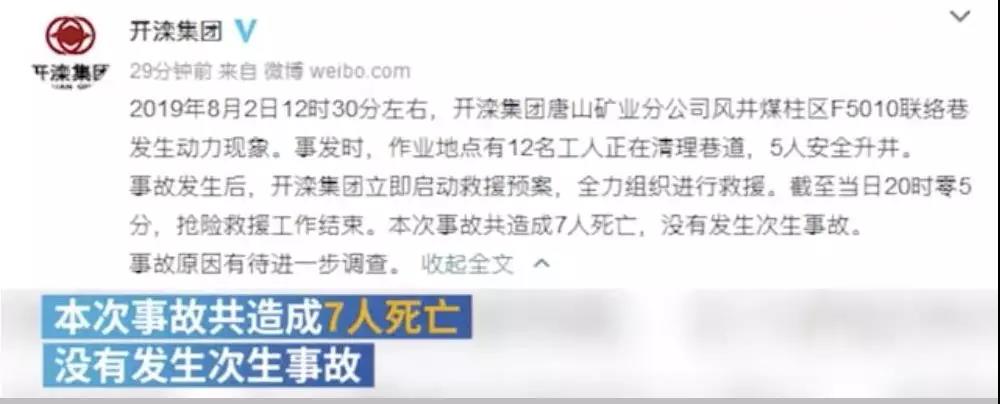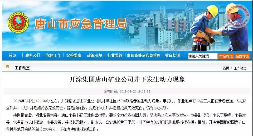 昨日(8月2日)唐山市應(yīng)急管理局發(fā)布消息稱:2019年8月2日12:30分左右,開灤集團(tuán)唐山礦業(yè)公司風(fēng)井煤柱區(qū)F5010聯(lián)絡(luò)巷發(fā)生動力現(xiàn)象。事發(fā)時,作業(yè)地點有12名工人正在清理巷道,5人安全升井,1人升井后經(jīng)搶救無效死亡。經(jīng)后續(xù)施救,先后有3人升井后經(jīng)搶救無效死亡,仍有3人失聯(lián)。