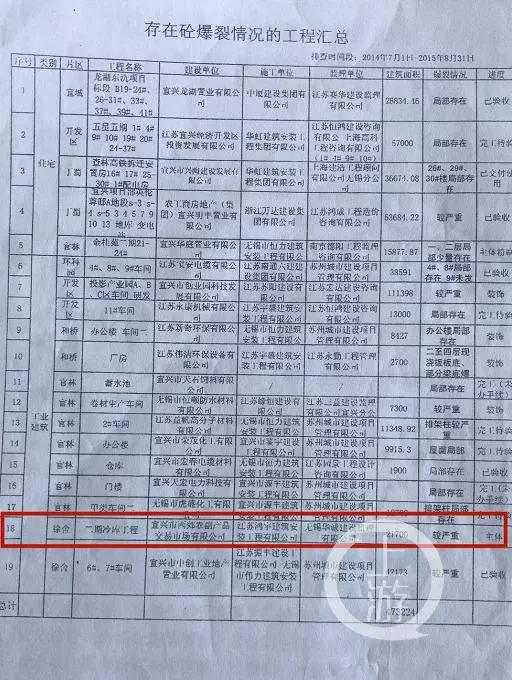 19個(gè)項(xiàng)目中,西郊農(nóng)副產(chǎn)品交易市場(chǎng)屬較為嚴(yán)重情形。受訪(fǎng)者供圖,三木建材簽約時(shí)疑無(wú)生產(chǎn)資質(zhì)此外,記者梳理發(fā)現(xiàn),19個(gè)項(xiàng)目中還涉及5處住宅項(xiàng)目,其中一處為拆遷安置房。目前除西郊農(nóng)副產(chǎn)品交易市場(chǎng)外,大部分項(xiàng)目已通過(guò)修復(fù)、退房等方式解決了遺留問(wèn)題。另外,記者注意到,宜興市三木建材有限公司與江蘇鴻宇建筑安裝工程有限公司合同簽訂時(shí)間為2014年9月23日,但在宜興市住建局建設(shè)工程質(zhì)量監(jiān)督站提供的由無(wú)錫市建設(shè)局發(fā)放的《建筑業(yè)企業(yè)資質(zhì)證書(shū)》上卻標(biāo)注,宜興市三木建材有的公司取得生產(chǎn)資質(zhì)的時(shí)間為2014年10月24日。對(duì)此,宜興市住建局建設(shè)工程質(zhì)量監(jiān)督站相關(guān)負(fù)責(zé)人程冰表示,在此之前宜興市三木建材有限公司是有預(yù)生產(chǎn)資格的。一般對(duì)混凝土檢測(cè)只是根據(jù)國(guó)家規(guī)定進(jìn)行強(qiáng)度測(cè)試,多次檢測(cè)過(guò)程中均顯示合格,且目前國(guó)家并無(wú)混凝土中不允許摻雜鋼渣的規(guī)定。“當(dāng)時(shí)該企業(yè)給我們上報(bào)成分時(shí)并未標(biāo)注有鋼渣成分,而且據(jù)我們調(diào)查,企業(yè)不是在所有批次中均添加鋼渣。且由于鋼渣中存在游離成分,放置時(shí)間長(zhǎng)的也就揮發(fā)掉了,沒(méi)有揮發(fā)的游離成分被添加在混泥土中,遇水則發(fā)生了氧化反應(yīng)。其氧化和爆裂的時(shí)間也是無(wú)法確定的。”程冰解釋。而對(duì)于為何在混凝土中添加鋼渣,此前,宜興三木建材有限公司負(fù)責(zé)人繆幸福在接受媒體采訪(fǎng)時(shí)稱(chēng),28天的石塊反應(yīng)期內(nèi)并沒(méi)有出現(xiàn)過(guò)爆裂現(xiàn)象。在混凝土中添加廢鋼渣是不少混凝土企業(yè)的常用手法,且其發(fā)現(xiàn)將廢鋼渣添加到混凝土中后會(huì)增加其硬度,因此才將廢鋼渣當(dāng)做粗骨料與石子一起添加到混凝土中使用。而對(duì)于出現(xiàn)問(wèn)題后如何處理,繆幸福稱(chēng)還在等待權(quán)威部門(mén)的鑒定結(jié)果,而這一等就是4年時(shí)間。