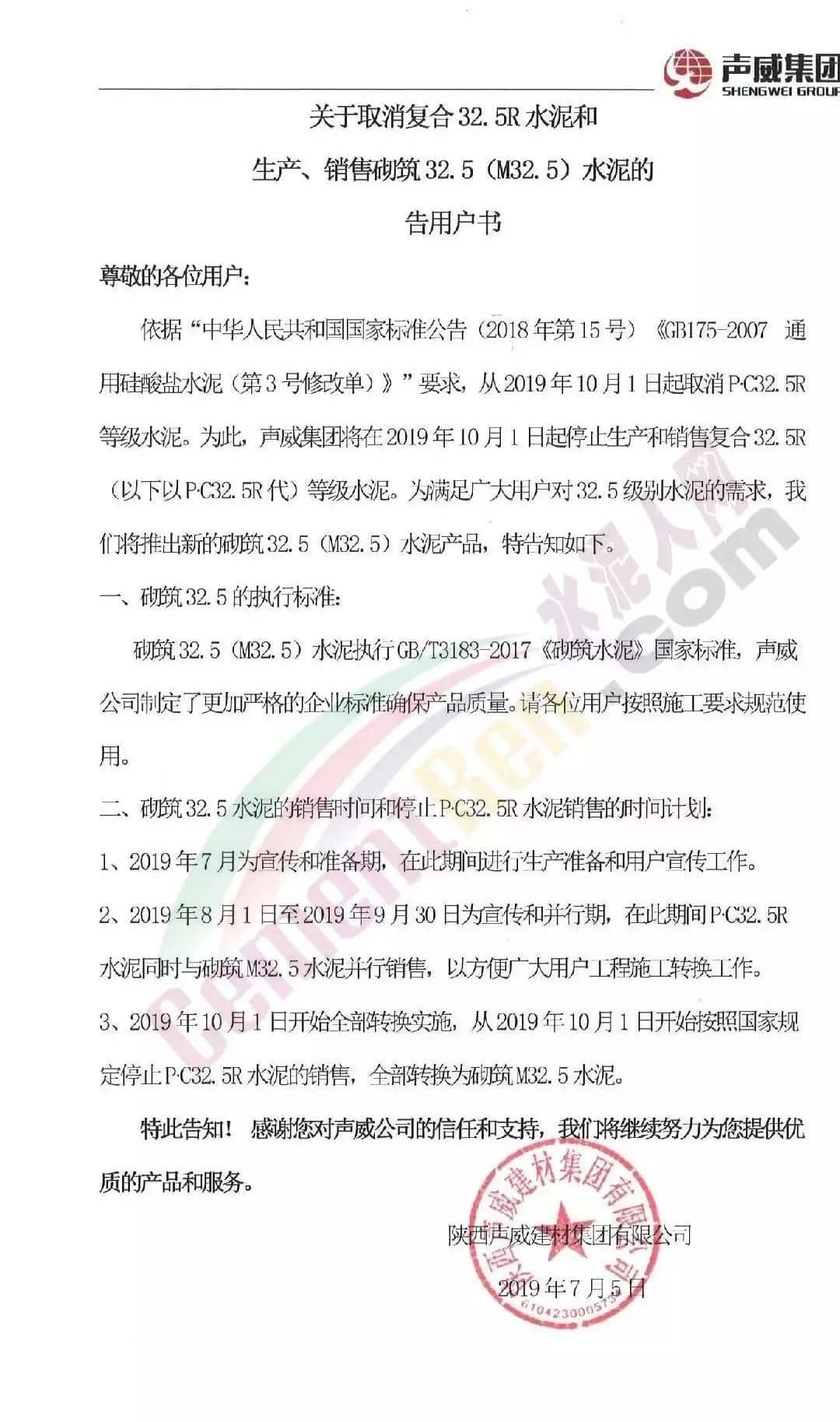 堯柏集團M32.5砌筑水泥客戶告知書