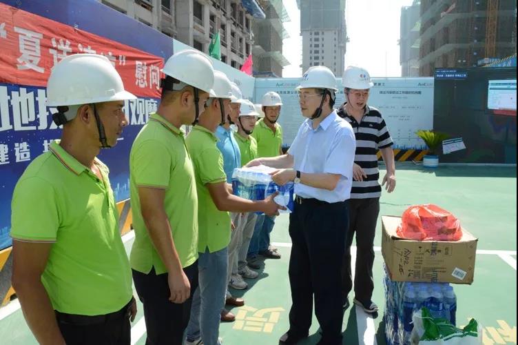 國貿(mào)集團(tuán)黨委書記、董事長范陽向現(xiàn)場施工人員贈送了仁丹、綠豆等防暑降溫用品。