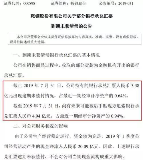 那么,究竟發(fā)生了什么事,整個A股公司持有應收票據的規(guī)模有多少,哪些公司應收票據又特別多呢?一份差點被市場遺忘的公告如果你手上有一堆錢,到金融機構卻發(fā)現兌付不了,你會怎么辦?鞍鋼股份的選擇是,將此事比較克制地告訴大家。8月1日,鞍鋼股份披露了一份《關于部分銀行承兌匯票到期未獲清償的公告》。公告顯示,公司在銷售商品過程中,收取的部分貨款為金融機構開出的銀行承兌匯票。截止2019年7月31日,公司持有的銀行承兌匯票人民幣3.38億元出現逾期未償付情況,占最近一期經審計凈資產的0.64%。截至2019年7月31日,尚有未來可能被后手貼現方追索銀行承兌匯票人民幣4.94億元,占最近一期經審計凈資產的0.94%。