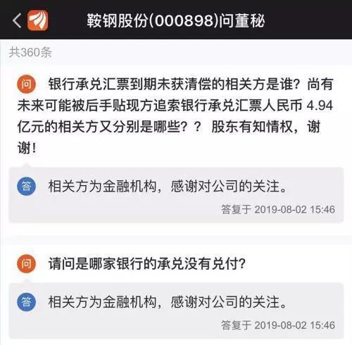 鞍鋼股份表示,由于公司生產經營穩(wěn)定運行,資金較為充足,2019年1季度公司經營活動產生的現金凈流入人民幣20.09億元。因此,上述銀行承兌匯票逾期未獲償付,不會對公司當期現金流構成重大影響。公司亦給出了應對措施。公司表示,出現票據延遲兌付情況后,公司多次與相關方商討解決方案,及時溝通落實還款方案,現已取得所有票據前手客戶以及開具銀行承兌匯票相關金融機構的還款承諾函。上述相關方目前正在陸續(xù)償還逾期票據兌付款。目前,根據票據到期時間及兌付情況,公司已陸續(xù)啟動了對票據逾期的相關方法律訴訟追索程序,以督促相關方盡快償付相關逾期票據兌付款。同時,公司進一步完善風控體系,嚴格控制票據風險。公司將持續(xù)與上述相關方進行溝通,敦促其償還逾期票據兌付款。在這份公告中,鞍鋼股份并未指出是哪家金融機構違約,但此事還是引起了投資者的強烈關注。有投資者在投資者互動平臺就此事詢問鞍鋼股份董秘,但未獲明確回復。