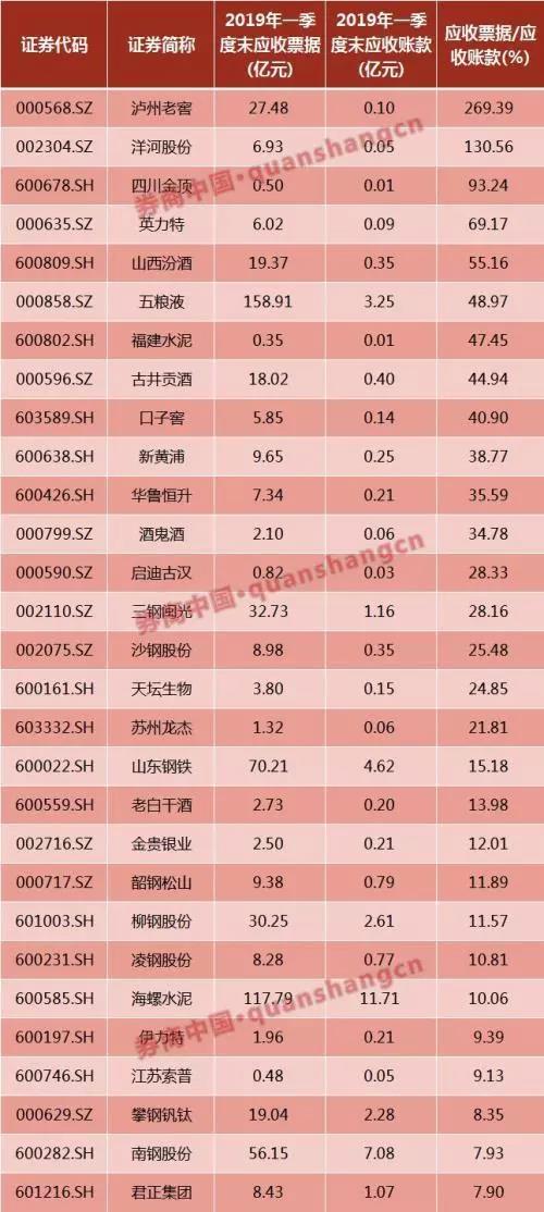 而從應收票據占應收賬款的比例來看,A股市場有206家應收票據超過應收賬款的上市公司,其中白酒類上市公司持有的應收票據比例普遍較高,瀘州老窖應收項中幾乎全是應收票據。其次是鋼鐵板塊。