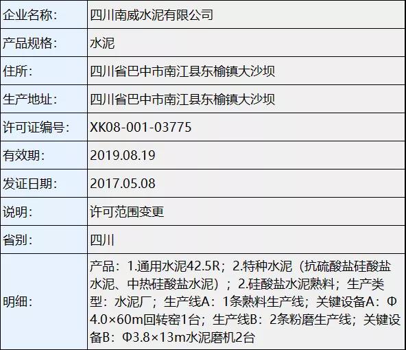 市場監(jiān)管總局生產(chǎn)許可證辦公室數(shù)據(jù)顯示四川南威水泥有限公司(XK08-001-03775)生產(chǎn)地址位為四川省巴中市南江縣東榆鎮(zhèn)大沙壩。生產(chǎn)許可證明細顯示:產(chǎn)品:通用水泥42.5R;特種水泥(抗硫酸鹽硅酸鹽水泥、中熱硅酸鹽水泥);硅酸鹽水泥熟料;生產(chǎn)類型:水泥廠;生產(chǎn)線A:1條熟料生產(chǎn)線;關(guān)鍵設(shè)備A:Φ4.0×60m回轉(zhuǎn)窯1臺;生產(chǎn)線B:2條粉磨生產(chǎn)線;關(guān)鍵設(shè)備B:Φ3.8×13m水泥磨機2臺。