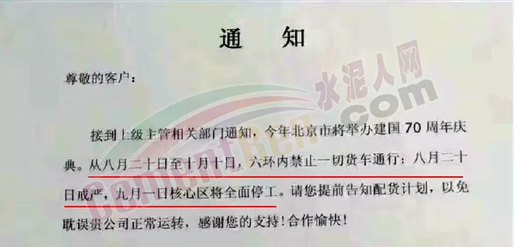 另有企業(yè)通知稱,接到上級(jí)主管相關(guān)部門通知 ,今年北京市將舉辦建國70周年慶典,從8月20日至10月10日,六環(huán)內(nèi)禁止一切貨車通行。8月20日戒嚴(yán),9月1日核心區(qū)將全面停工。