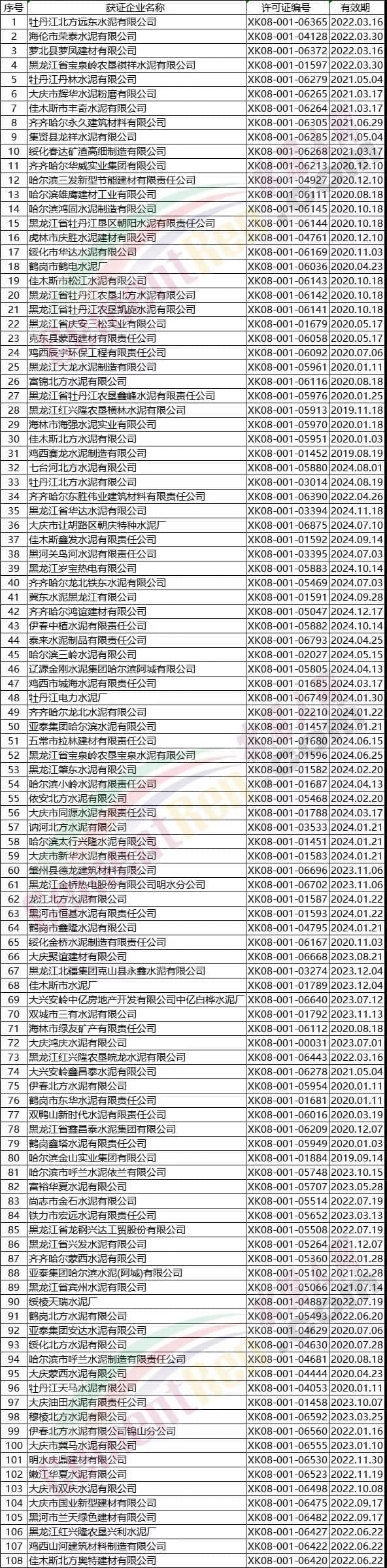 黑龍江部分水泥企業(yè)名單