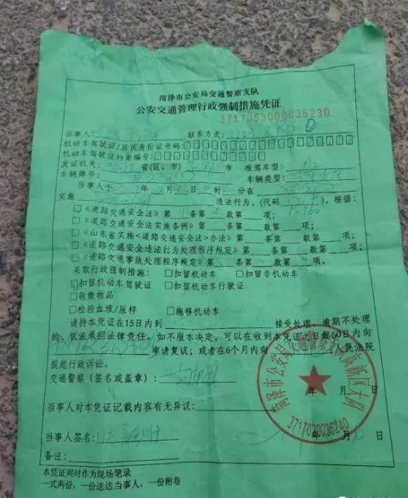 菏澤高新區(qū)交警開出的強(qiáng)制措施憑證