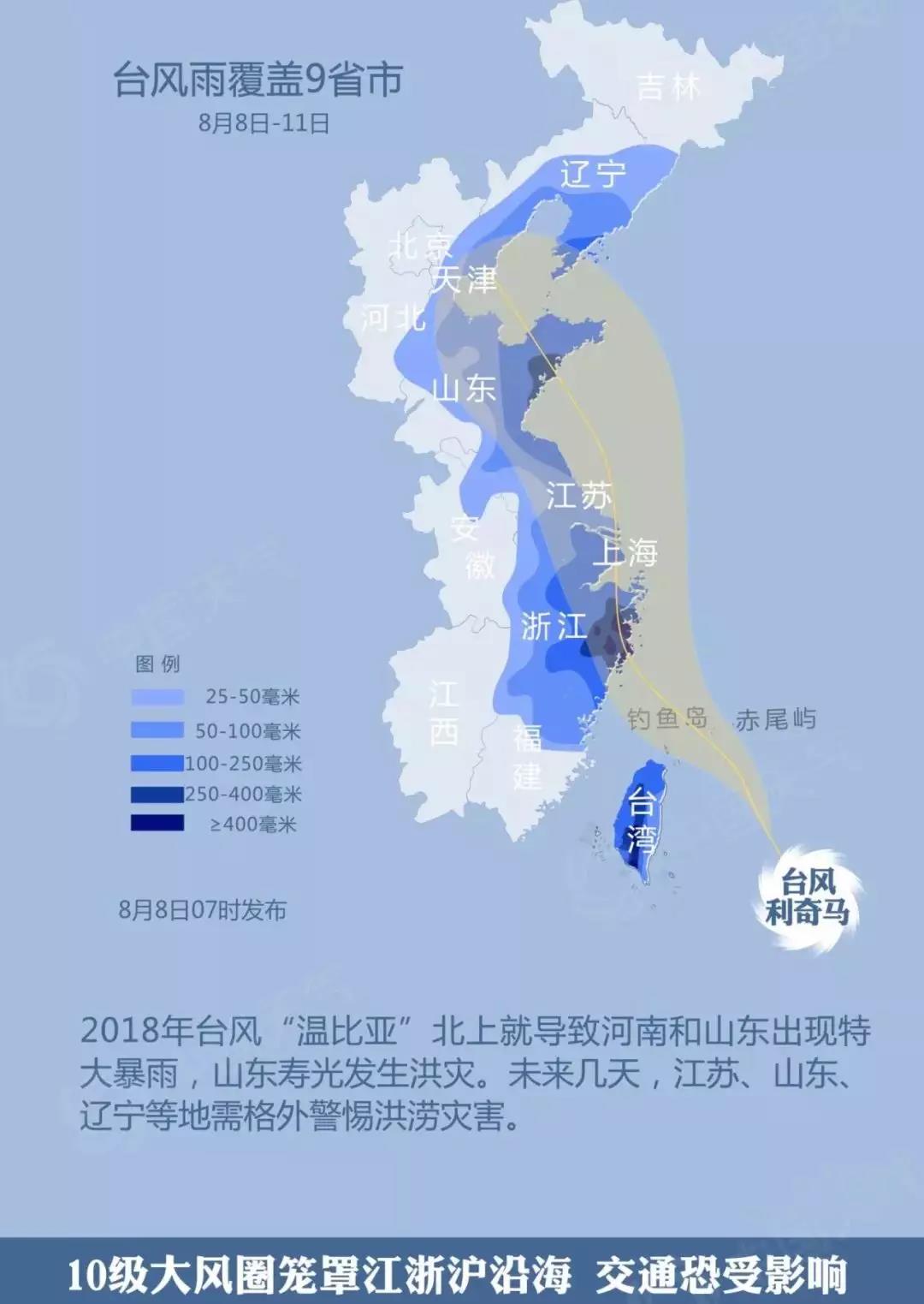 風(fēng)雨強度大——8日至13日,東海、黃海中西部、杭州灣、長江口區(qū)以及浙江、上海、江蘇、山東南部等地沿海將有9至12級大風(fēng),部分海域風(fēng)力將達到13至16級,陣風(fēng)17級以上。8日至11日,臺灣島、浙江中東部、上海、江蘇東部、山東東部、遼東半島等地將有大暴雨,臺灣島中部、浙江東部等地局地特大暴雨,浙江東部累計降雨量300至500毫米,臺灣島中部達500至700毫米。