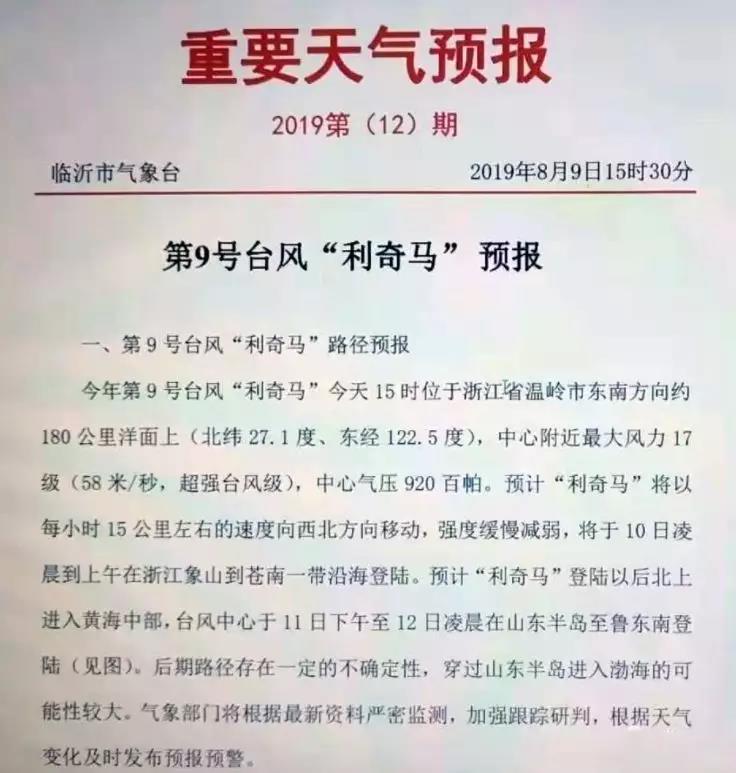 山東省氣象局發(fā)布第9號臺風(fēng)“利奇馬”預(yù)報稱,預(yù)計臺風(fēng)中心于11日下午至12日凌晨在山東半島至魯東南登陸。后期路徑存在一定的不確定性,穿過山東半島進入渤海的可能性較大。預(yù)計“利奇馬”外圍 云“系于10日下午開始影響山東省。