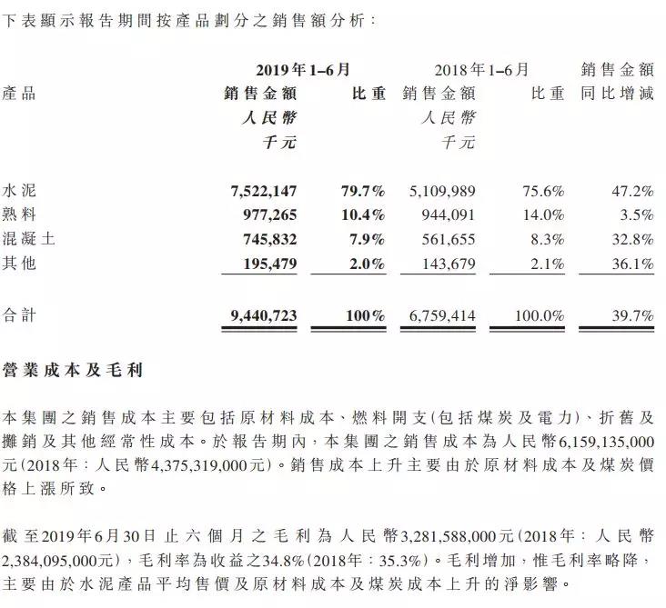 報(bào)告期內(nèi),本集團(tuán)銷售水泥、熟料合計(jì)23,932,000噸,同比增加27.8%;銷售商品混凝土1,504,000立方米,同比增加19.5%。營業(yè)收入人民幣9,440,723,000元,同比增加39.7%;本期盈利人民幣1,205,641,000元。