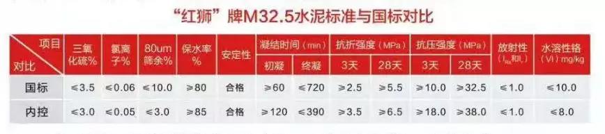 紅獅水泥江西、四川、福建等區(qū)域先后推出M32.5新品,其新品所使用的熟料、石膏、混合材品種與“紅獅”牌P.C32.5水泥一致,質(zhì)量穩(wěn)定 ,富裕強度高,具有需水量少、泌水性小、保水率高等優(yōu)點,水泥色澤一致,配置的混凝土體積穩(wěn)定性好,可廣泛用于砌筑,抹面砂漿、墊層及配置C25以下普通混凝土。“紅獅”牌M32.5水泥標(biāo)準(zhǔn)與國際對比數(shù)據(jù)如下: