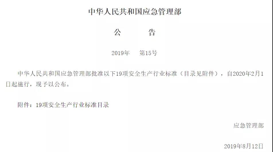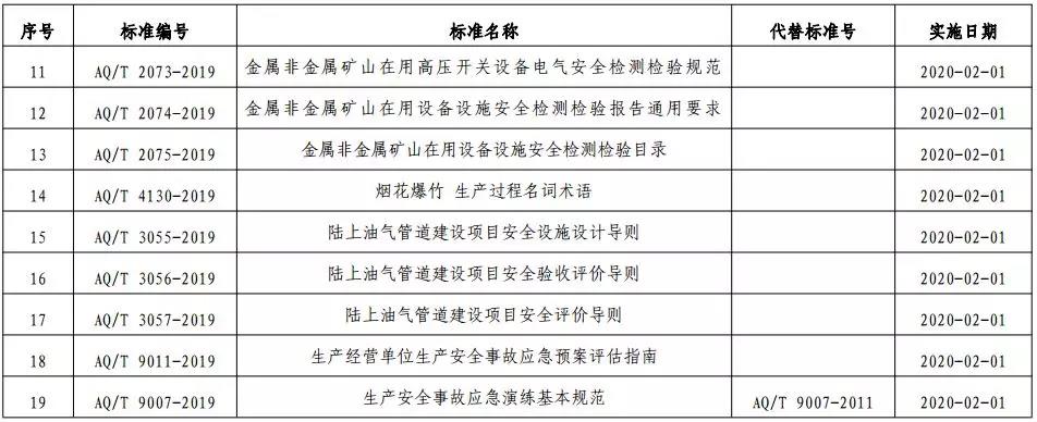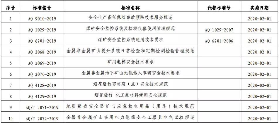 水泥人網(wǎng)消息:日前,應(yīng)急管理部發(fā)布2019年第15號(hào)公告稱,已批準(zhǔn)了包括安全生產(chǎn)責(zé)任保險(xiǎn)事故預(yù)防技術(shù)服務(wù)規(guī)范(AQ 9010-2019 )、 金屬非金屬礦山提升系統(tǒng)日常檢查和定期檢測(cè)檢驗(yàn)管理規(guī)范(AQ 2068-2019)、 金屬非金屬地下礦山無(wú)軌運(yùn)人車(chē)輛安全技術(shù)要求(AQ 2070-2019)、金屬非金屬礦山在用電力絕緣安全工器具電氣試驗(yàn)規(guī)范(AQ/T 2072-2019 )、金屬非金屬礦山在用高壓開(kāi)關(guān)設(shè)備電氣安全檢測(cè)檢驗(yàn)規(guī)范(AQ/T 2073-2019 )、金屬非金屬礦山在用設(shè)備設(shè)施安全檢測(cè)檢驗(yàn)報(bào)告通用要求(AQ/T 2074-2019 )、 金屬非金屬礦山在用設(shè)備設(shè)施安全檢測(cè)檢驗(yàn)?zāi)夸?AQ/T 2075-2019)、生產(chǎn)經(jīng)營(yíng)單位生產(chǎn)安全事故應(yīng)急預(yù)案評(píng)估指南(AQ/T 9011-2019 )、 生產(chǎn)安全事故應(yīng)急演練基本規(guī)范(AQ/T 9007-2019)等標(biāo)準(zhǔn)在內(nèi)的19項(xiàng)安全生產(chǎn)行業(yè)標(biāo)準(zhǔn),并將自明年年2月1日起施行。