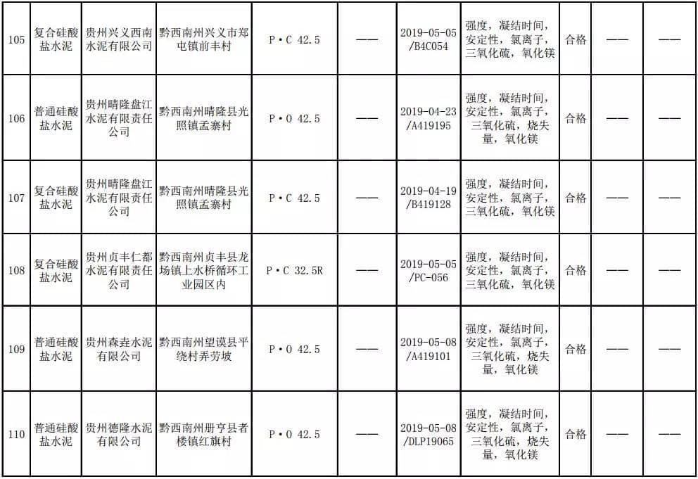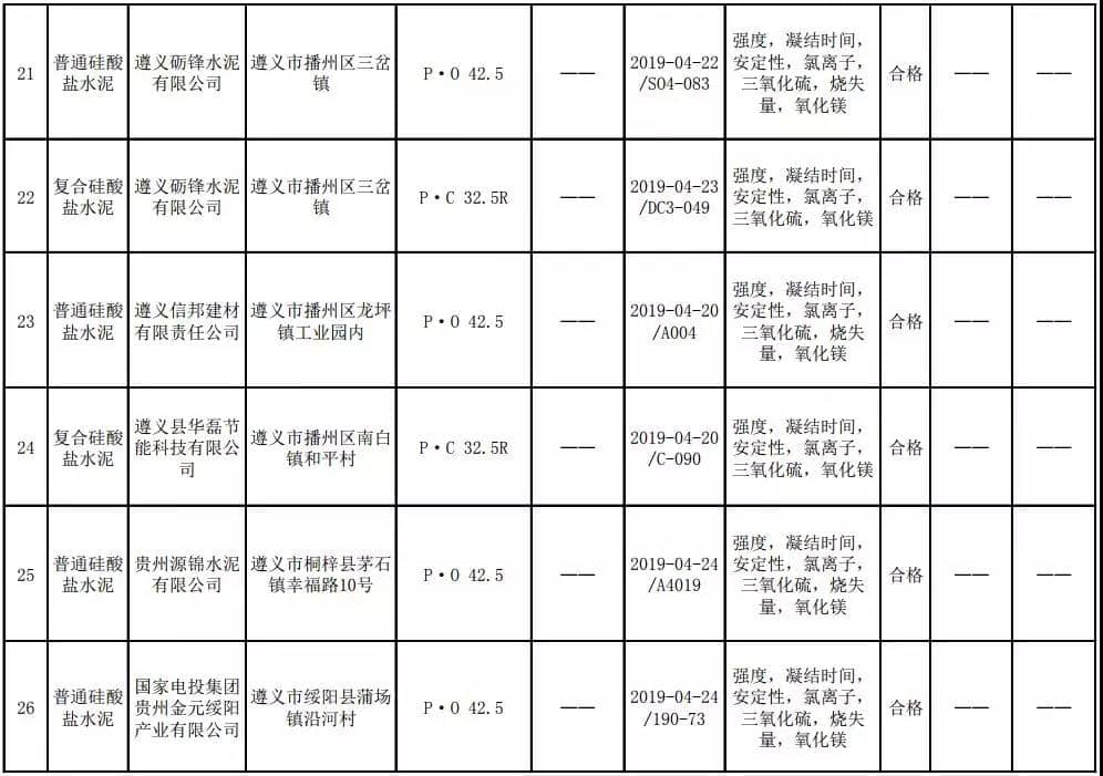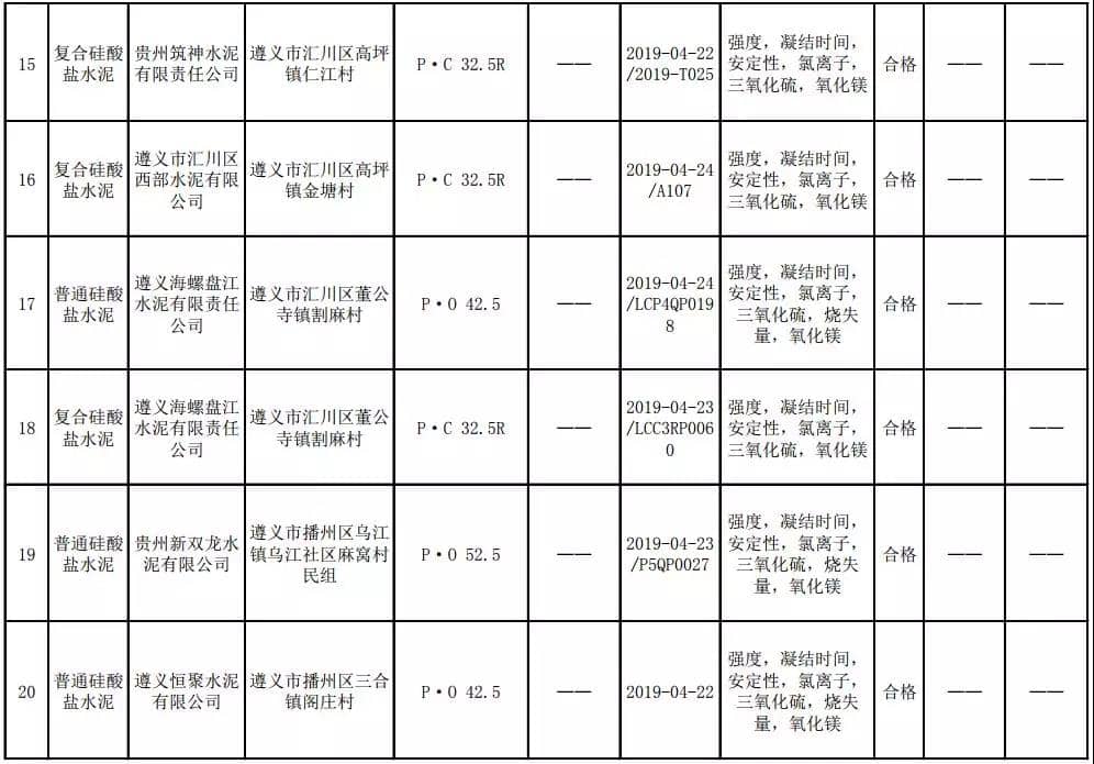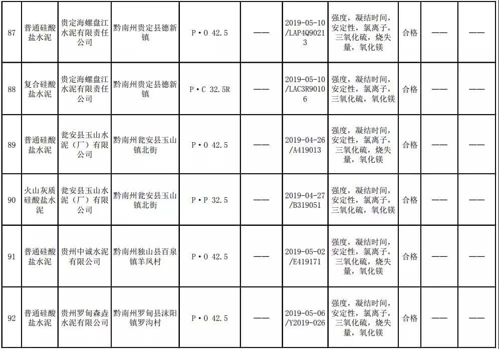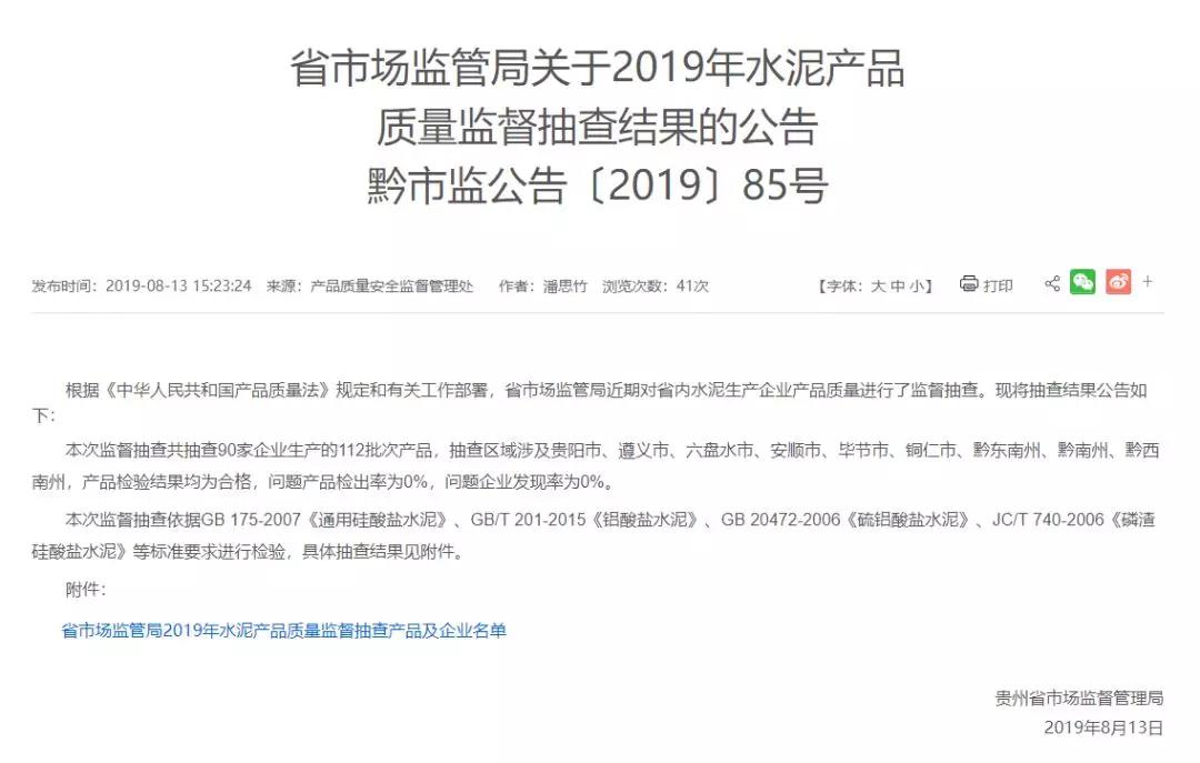 2019年8月13日,貴州省市場(chǎng)監(jiān)督管理局網(wǎng)站公布2019年水泥產(chǎn)品質(zhì)量監(jiān)督抽查結(jié)果。本次監(jiān)督抽查共抽查90家企業(yè)生產(chǎn)的112批次產(chǎn)品,抽查區(qū)域涉及貴陽(yáng)市、遵義市、六盤(pán)水市、安順市、畢節(jié)市、銅仁市、黔東南州、黔南州、黔西南州,產(chǎn)品檢驗(yàn)結(jié)果均為合格,問(wèn)題產(chǎn)品檢出率為0%,問(wèn)題企業(yè)發(fā)現(xiàn)率為0%。