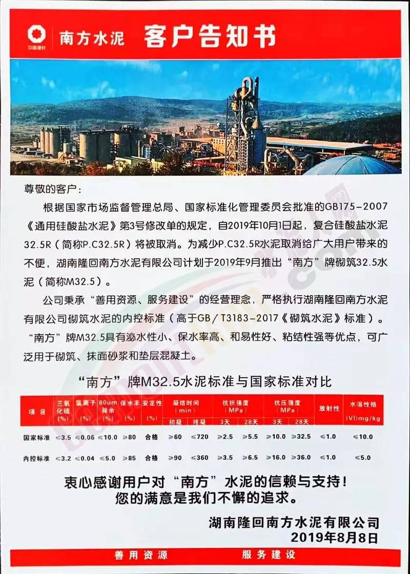 南方水泥秉承“善用資源、服務建設”的經(jīng)營理念,嚴格執(zhí)行湖南隆回南方水泥有限公司砌筑水泥的內(nèi)控標準(高于GB/T3183-2017《砌筑水泥》標準)。“南方”牌M32.5具有泌水性小,保水率高、和易性好、粘接性強等優(yōu)點,可廣泛用于砌筑,抹面砂漿和墊層混凝土。南方水泥客戶告知書原文如下: