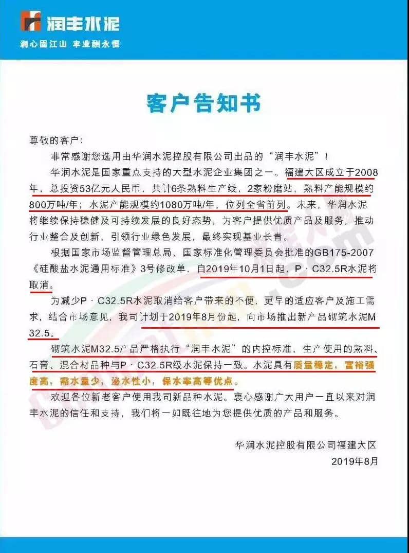 同期,華潤水泥控股有限公司福建大區(qū)亦發(fā)布了《客戶告知書》稱,福建大區(qū)成立 于2008年,總投資53億元人民幣,共計6條熟料生產(chǎn)線,2家粉磨站,熟料產(chǎn)能規(guī)模約800萬噸/年,位列全省前列。根據(jù)國家市場監(jiān)督管理總局、國家標準化管理委員會批準的GB175-2007《硅酸鹽水泥通用標準》3號修改單,自2019年10月1日起,P.C32.5R水泥將取消。為減少P.C32.5R水泥取消給客戶帶來的不便,更早的適應客戶及施工需求,結合市場意見,公司計劃于2019年8月份起,向市場推出新產(chǎn)品砌筑水泥M32.5。砌筑水泥M32.5產(chǎn)品嚴格執(zhí)行“潤豐水泥”的內(nèi)控標準,生產(chǎn)使用的熟料、石膏、混合材品種用P.C32.5R級水泥保持一致。水泥具有質量穩(wěn)定、富裕強度高,需水量少,泌水性小,保水率高等優(yōu)點。