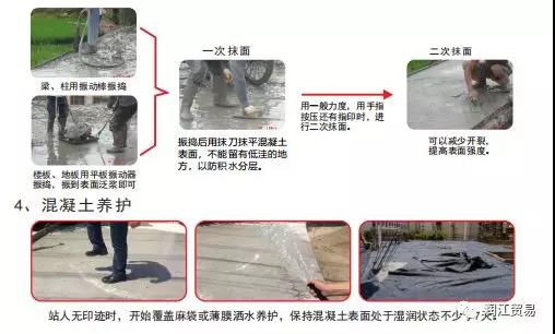 2)碎石:含泥量≤1.0%,泥塊含量≤0.2%;針片狀顆粒含量≤10%;宜使用2cm-3cm連續(xù)級配石子; 3)水:使用飲用水 、自來水;不得使用海水、生活污水及含有糖分、油漬、酸堿度高的水;4)水泥:水泥在運輸過程與儲存時不得受潮和混入雜物等;水泥要根據(jù)不同生產(chǎn)廠家、品種、強度等級、批次分別存放,不得混雜;水泥進出庫要做到先進先出,后進后出;水泥存放時間過長,應重新取樣檢驗,確定符合標準后方可使用;對于南方多雨季節(jié),建議盡快用完,避免存放時間過長;根據(jù)工程特點、設計、施工要求及所處的環(huán)境,選用適當品種和強度等級的水泥,同一施工部位應采用同一廠家、同一品種、同一強度等級的水泥2、施工過程混凝土表面接近初凝時(判斷方法:按一般力度,用手指按壓,有手印且略有粘手),用鋼抹刀進行二次壓平、壓光;接近終凝時(判斷方法:按一般力度,用手指按壓,略有手印但不粘手),進行第三次抹壓。終凝前發(fā)現(xiàn)表面有干縮裂縫,應立即采取抹壓措施予以消除,然后立即用濕麻袋或薄膜覆蓋養(yǎng)護。注意灑水養(yǎng)護,保持混凝土表面一直處于濕潤狀態(tài),如此養(yǎng)護不少于7天時間。以上措施可有效預防裂縫的產(chǎn)生。