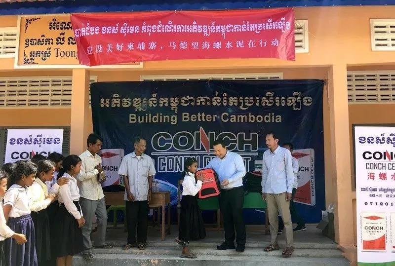 8月13日,馬德望海螺水泥有限公司的同胞,就來到實居省Krang Tom小學,捐贈228套書包套裝及排球、足球等學習和體育用品,用以改善該校的教學和生活條件。