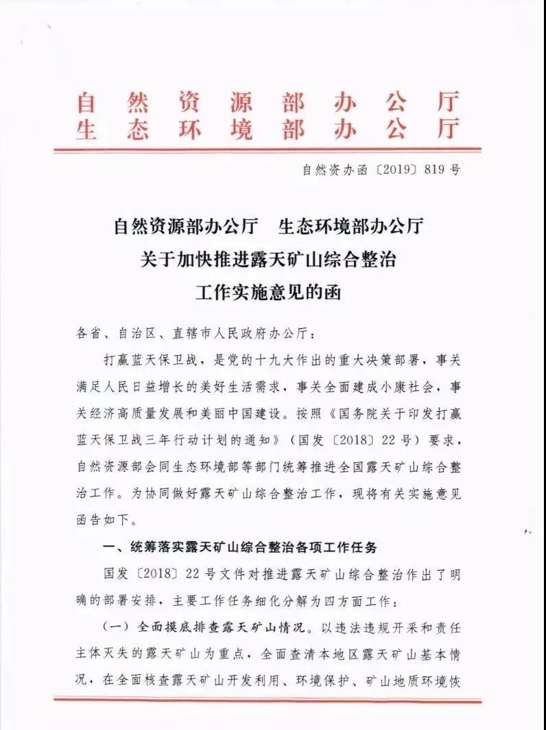 打贏藍(lán)天保衛(wèi)戰(zhàn),是黨的十九大作出的重大決策部署,事關(guān)滿足人民日益增長的美好生活需求,事關(guān)全面建成小康社會,事關(guān)經(jīng)濟(jì)高質(zhì)量發(fā)展和美麗中國建設(shè)。按照《國務(wù)院關(guān)于印發(fā)打贏藍(lán)天保衛(wèi)戰(zhàn)三年行動(dòng)計(jì)劃的通知》(國發(fā)〔2018〕22號)要求,自然資源部會同生態(tài)環(huán)境部等部門統(tǒng)籌推進(jìn)全國露天礦山綜合整治工作。為協(xié)同做好露天礦山綜合整治工作,現(xiàn)將有關(guān)實(shí)施意見函告如下。