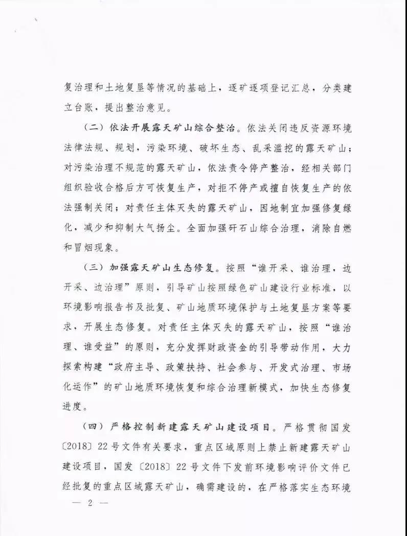 (二)依法開展露天礦山綜合整治。依法關(guān)閉違反資源環(huán)境法律法規(guī)、規(guī)劃,污染環(huán)境、破壞生態(tài)、亂采濫挖的露天礦山;對污染治理不規(guī)范的露天礦山,依法責(zé)令停產(chǎn)整治,經(jīng)相關(guān)部門組織驗(yàn)收合格后方可恢復(fù)生產(chǎn),對拒不停產(chǎn)或擅自恢復(fù)生產(chǎn)的依法強(qiáng)制關(guān)閉;對責(zé)任主體滅失的露天礦山,因地制宜加強(qiáng)修復(fù)綠化,減少和抑制大氣揚(yáng)塵。全面加強(qiáng)矸石山綜合治理,消除自燃和冒煙現(xiàn)象。