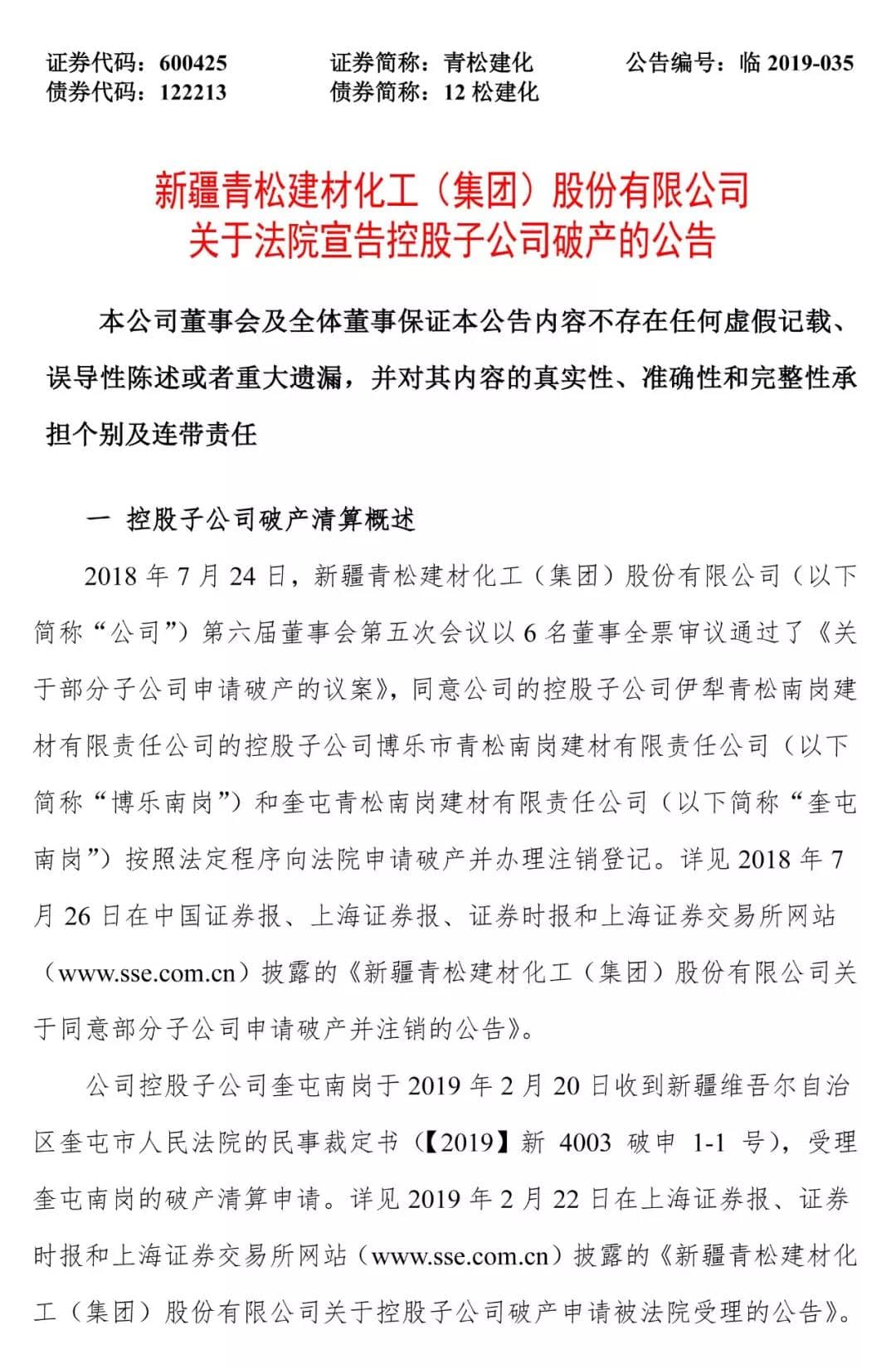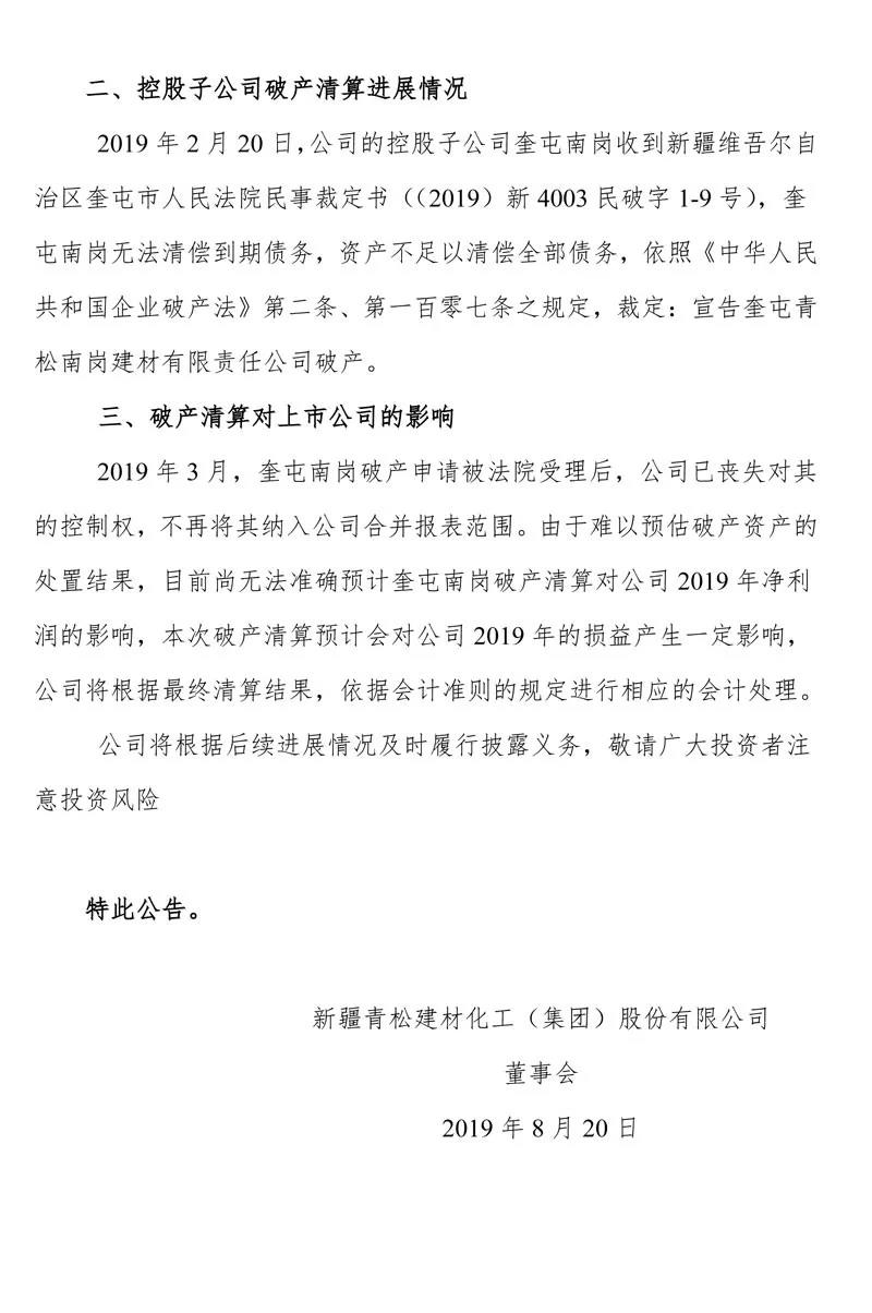 公司控股子公司奎屯南崗于2019年2月20日收到新疆維吾爾自治區(qū)奎屯市人民法院的民事裁定書(【2019】新4003破申1-1號),受理奎屯南崗的破產(chǎn)清算申請。詳見2019年2月22日在上海證券報、證券時報和上海證券交易所網(wǎng)站(www.sse.com.cn)披露的《新疆青松建材化工(集團)股份有限公司關(guān)于控股子公司破產(chǎn)申請被法院受理的公告》
