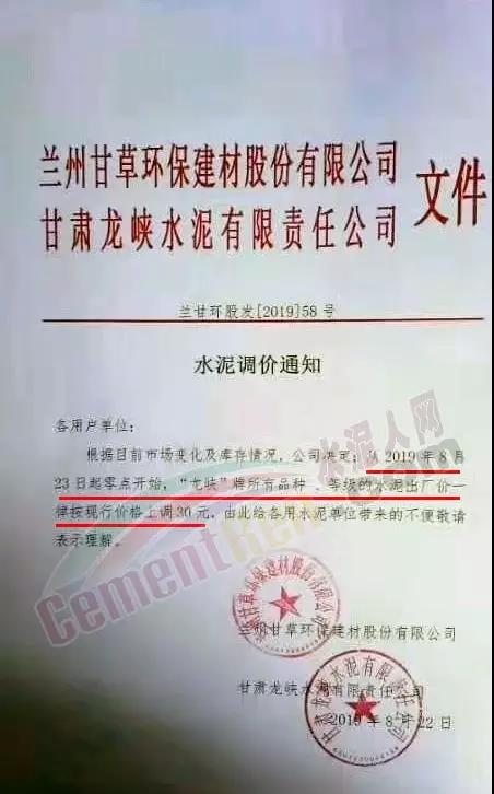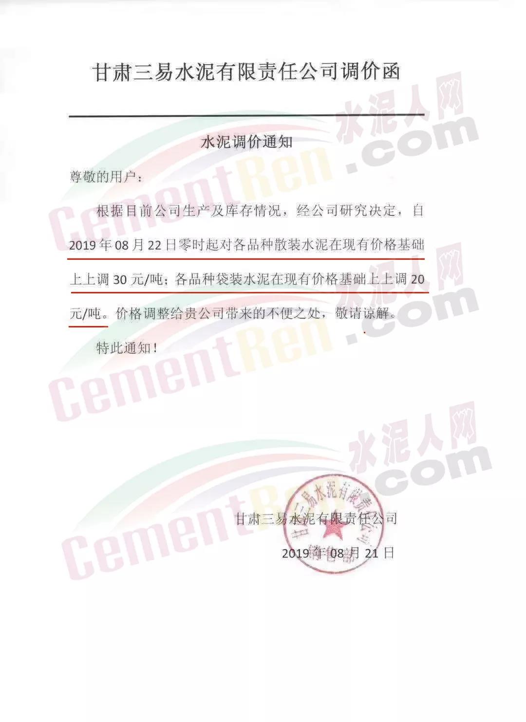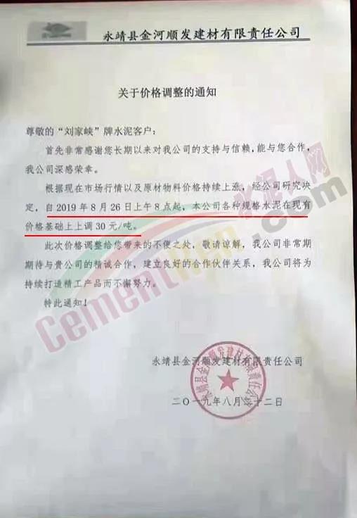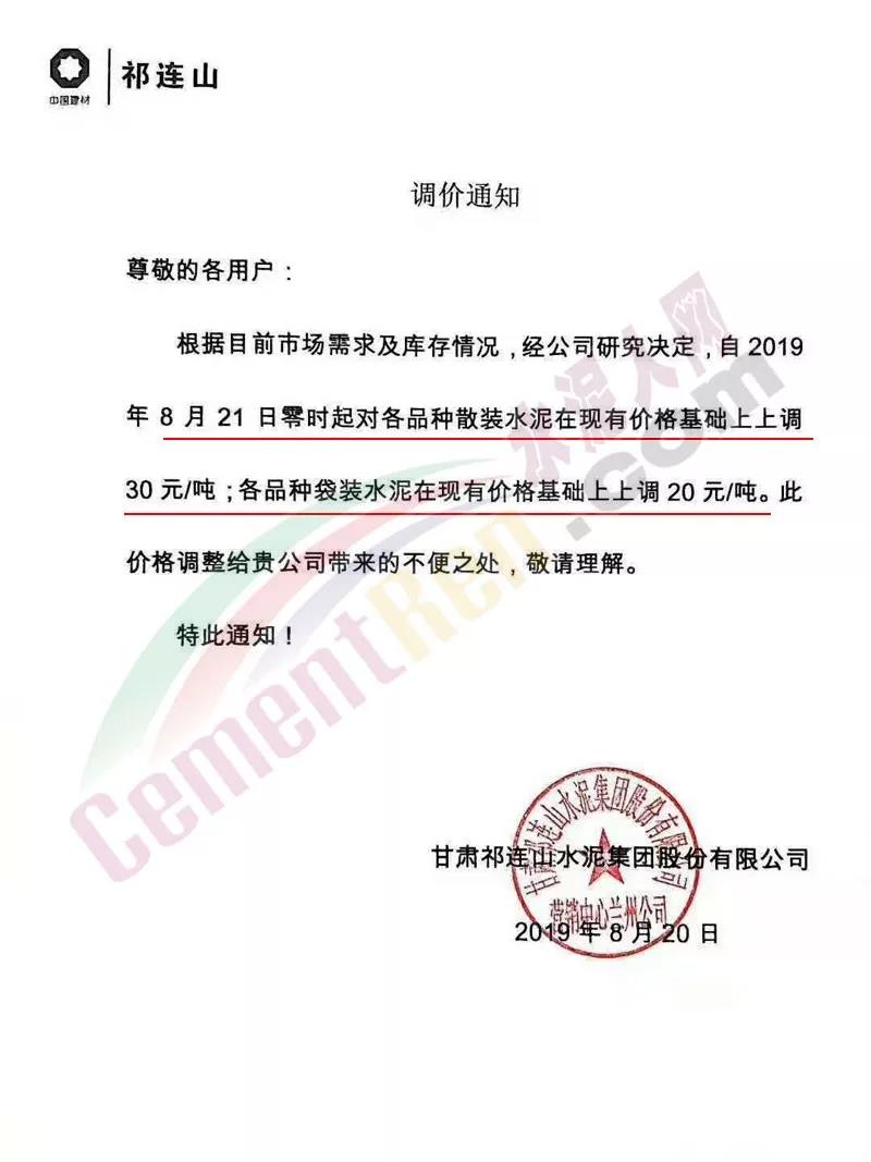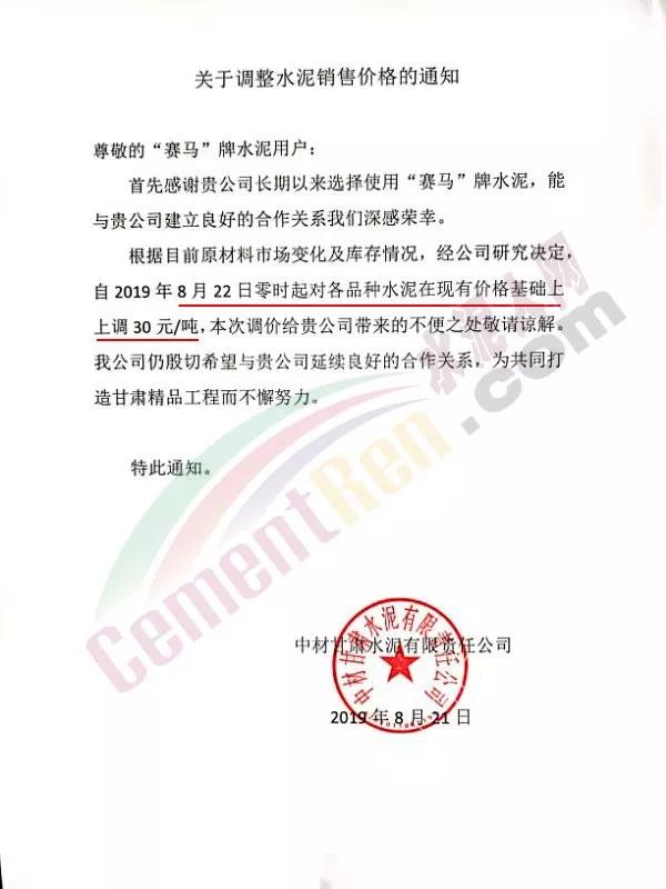 根據(jù)當(dāng)前市場(chǎng)形勢(shì)經(jīng)我公司研究決定,自2019年08月22日上午9:00點(diǎn)起所有水泥品種價(jià)格統(tǒng)一上調(diào)30元/噸。