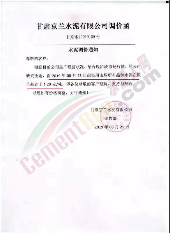 結(jié)合當(dāng)前周邊市場(chǎng)行情,經(jīng)公司商議決定自2019年8月22日上午9:30分整,32.5水泥袋裝、散裝在原價(jià)格基礎(chǔ)上每噸上調(diào)10元;42.5水泥袋裝、散裝在原價(jià)格基礎(chǔ)上每噸上調(diào)10元,特此通知!