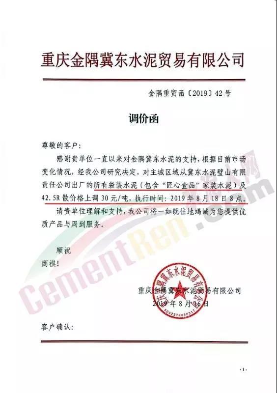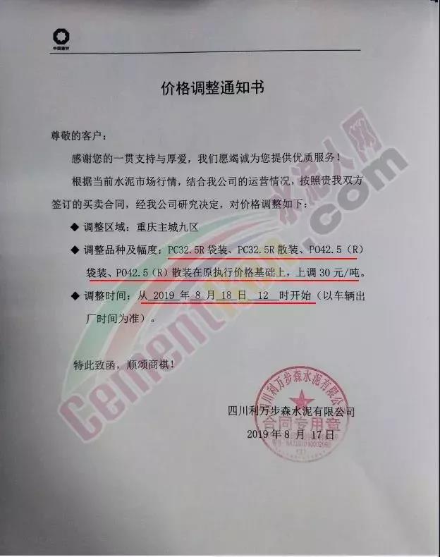 因近期原燃材料成本上漲,我公司現(xiàn)決定于2019年8月22日8:00針對(duì)PO42.5散裝價(jià)格進(jìn)行調(diào)整,價(jià)格上調(diào)60元/噸。