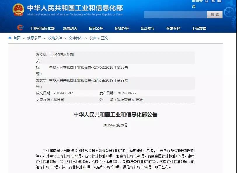 日前,工信部網(wǎng)站發(fā)布了2019年第29號公告。公告表明,工業(yè)和信息化部批準(zhǔn)《銅鋅合金粉》等436項(xiàng)行業(yè)標(biāo)準(zhǔn)(標(biāo)準(zhǔn)編號、名稱、主要內(nèi)容及實(shí)施日期見附件),其中化工行業(yè)標(biāo)準(zhǔn)29項(xiàng)、石化行業(yè)標(biāo)準(zhǔn)13項(xiàng)、冶金行業(yè)標(biāo)準(zhǔn)48項(xiàng)、有色金屬行業(yè)標(biāo)準(zhǔn)115項(xiàng)、建材行業(yè)標(biāo)準(zhǔn)12項(xiàng)、稀土行業(yè)標(biāo)準(zhǔn)11項(xiàng)、機(jī)械行業(yè)標(biāo)準(zhǔn)78項(xiàng)、制藥裝備行業(yè)標(biāo)準(zhǔn)7項(xiàng)、汽車行業(yè)標(biāo)準(zhǔn)13項(xiàng)、船舶行業(yè)標(biāo)準(zhǔn)7項(xiàng)、輕工行業(yè)標(biāo)準(zhǔn)48項(xiàng)、包裝行業(yè)標(biāo)準(zhǔn)1項(xiàng)、通信行業(yè)標(biāo)準(zhǔn)54項(xiàng),現(xiàn)予公布。