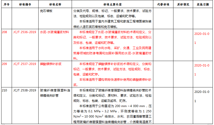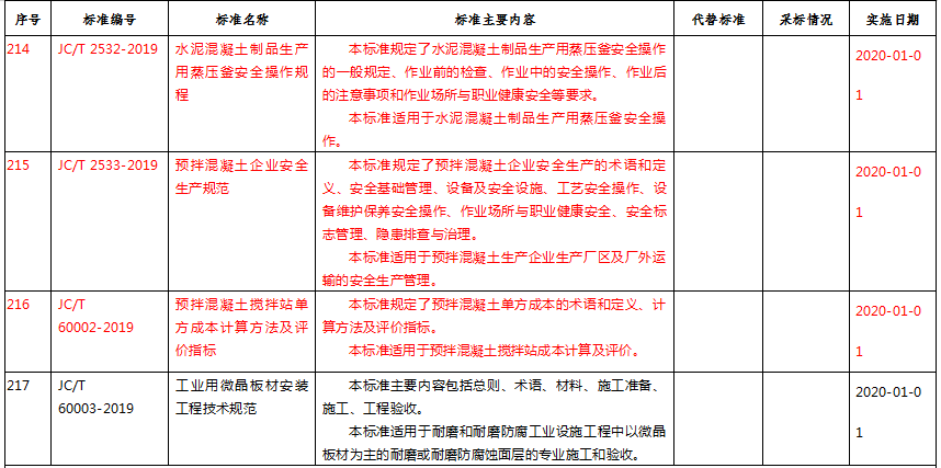 水泥行業(yè):標(biāo)準(zhǔn)編號為JC/T 2536-2019的水泥-水玻璃灌漿材料;標(biāo)準(zhǔn)編號為JC/T 2537-2019的磷酸鎂修補(bǔ)砂漿;標(biāo)準(zhǔn)編號為JC/T 2532-2019的水泥混凝土制品生產(chǎn)用蒸壓釜安全操作規(guī)程;標(biāo)準(zhǔn)編號為JC/T 2533-2019的預(yù)拌混凝土企業(yè)安全生產(chǎn)規(guī)范;標(biāo)準(zhǔn)編號為JC/T 60002-2019的預(yù)拌混凝土攪拌站單方成本計(jì)算方法及評價(jià)指標(biāo);這些標(biāo)準(zhǔn)被工信部批準(zhǔn),并且上述這些標(biāo)準(zhǔn)實(shí)施日期都是2020年1月1日。