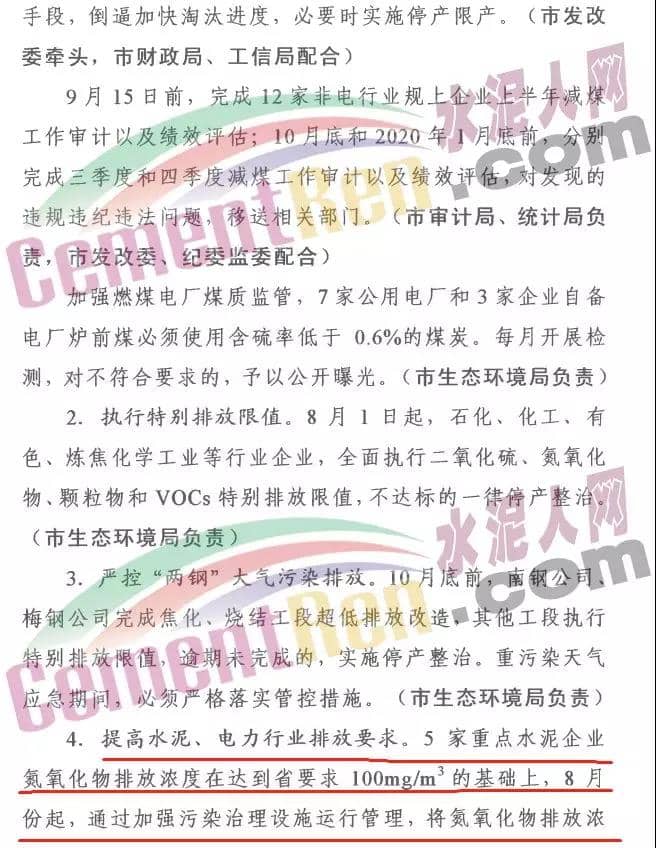 提高水泥、電力行業(yè)的排放要求,5家水泥企業(yè)氮氧化物排放濃度在達(dá)到省要求100毫克/立方米的基礎(chǔ)上,8月份起,通過加強(qiáng)污染治理設(shè)施運(yùn)行管理,將氮氧化物排放濃度控制在80毫克/立方米以來。由南京市生態(tài)環(huán)境局負(fù)責(zé)。