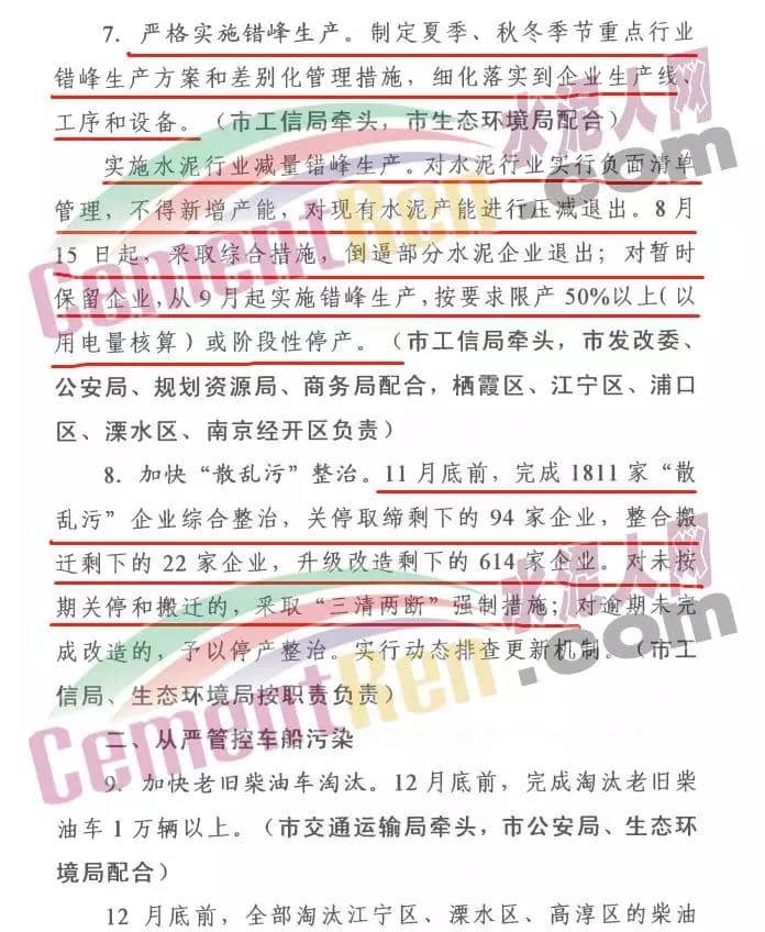 實(shí)施水泥行業(yè)減量錯(cuò)峰生產(chǎn)。對(duì)水泥行業(yè)實(shí)行負(fù)面清單管理,不得新增產(chǎn)能,對(duì)現(xiàn)有水泥產(chǎn)能進(jìn)行壓減退出。8月15日起,采取綜合措施,倒逼部分水泥企業(yè)退出;對(duì)暫時(shí)保留企業(yè),從9月份起實(shí)施錯(cuò)峰生產(chǎn),按要求限產(chǎn)50%以上(以用電量核算)或階段性停產(chǎn)。(市工信局牽頭,市發(fā)改委、公安局、規(guī)劃資源局、商務(wù)局配合,棲霞區(qū)、江寧區(qū)、浦口區(qū)、溧水區(qū)、南京經(jīng)開發(fā)區(qū)負(fù)責(zé))