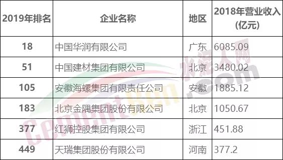 水泥行業(yè)的中國華潤有限公司、中國建材集團有限公司、安徽海螺集團有限責任公司、北京金隅集團股份有限公司、紅獅控股集團有限公司、天瑞集團股份有限公司等多家企業(yè)榜上有名。上述六家企業(yè)2018年營業(yè)收入合計13329.98億元。占500強榜單總營業(yè)收入的791000億元的1.69%。